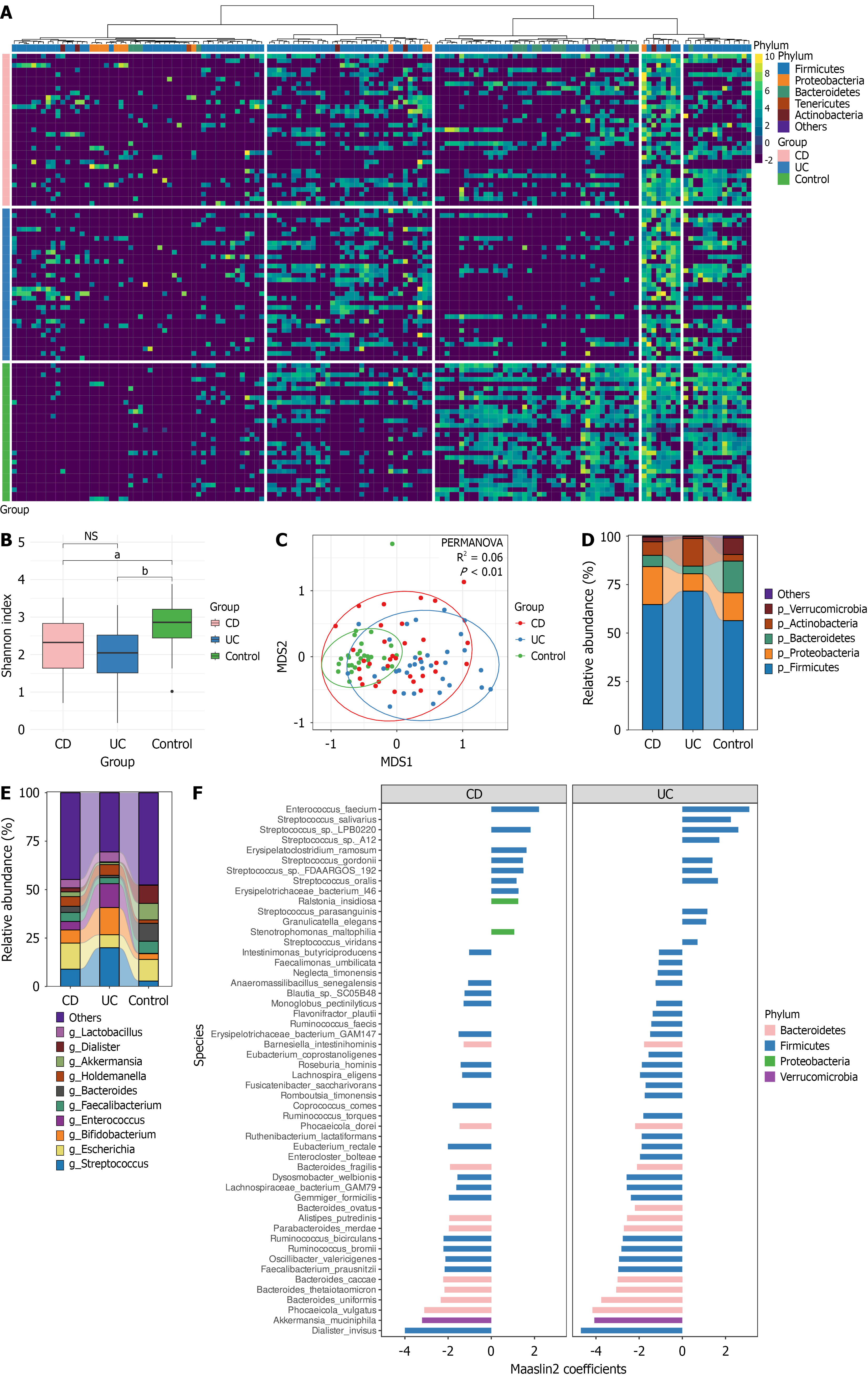 A: The most abundant genera in the gut microbiota of patients are presented as a heatmap. Colors denote the relative abundance of species obtained by the emu pipeline after log transformation using pseudo counts. The figure shows the top 90 by relative abundance species. The rows correspond to the samples/patients; the phylum-level taxonomic ranks are denoted with a right color bar. Hierarchical clustering was performed using the Euclidean distance and complete linkage; B: Shannon index distribution of stool samples across experimental groups. Different colors denote different experimental groups. Horizontal brackets show the P-value obtained by comparing corresponding groups using the Wilcoxon rank-sum test; C: Non-metric multidimensional scaling biplot obtained using taxonomic profiles at the species level of patients’ and healthy controls’ stool samples. Different groups are shown by different color dots. Permutational multivariate analysis of variance analysis results are presented in the lower left corner; D: Bar plots denote the distribution of phylum abundance across experimental groups. The X-axis showed experimental groups, Y-axis showed relative abundance. Different colors show different phyla; E: Bar plots denoted the distribution of genus abundance across experimental groups. The X-axis showed experimental groups, Y-axis showed relative abundance. Different colors show different genera. F: Results of identifying differentially abundant species between ulcerative colitis and coronavirus disease 2019 patient groups using Maalsin2 with the following thresholds: Minimum abundance = 0.01, minimum prevalence = 0.25, maximum significance = 0.05. The Y-axis shows microbial species, the X-axis - the Maaslin2 regression coefficient. Color indicates taxonomic affiliation at the order level for each identified species. aP > 0.05, obtained by comparison corresponded groups using the Wilcoxon rank-sum test. bP > 0.01, obtained by comparison corresponded groups using the Wilcoxon rank-sum test. UC: Ulcerative colitis; CD: Crohn’s disease; PERMANOVA: Permutational Multivariate Analysis of Variance; MDS: Multidimensional scaling ordinate; NS: Not significant.