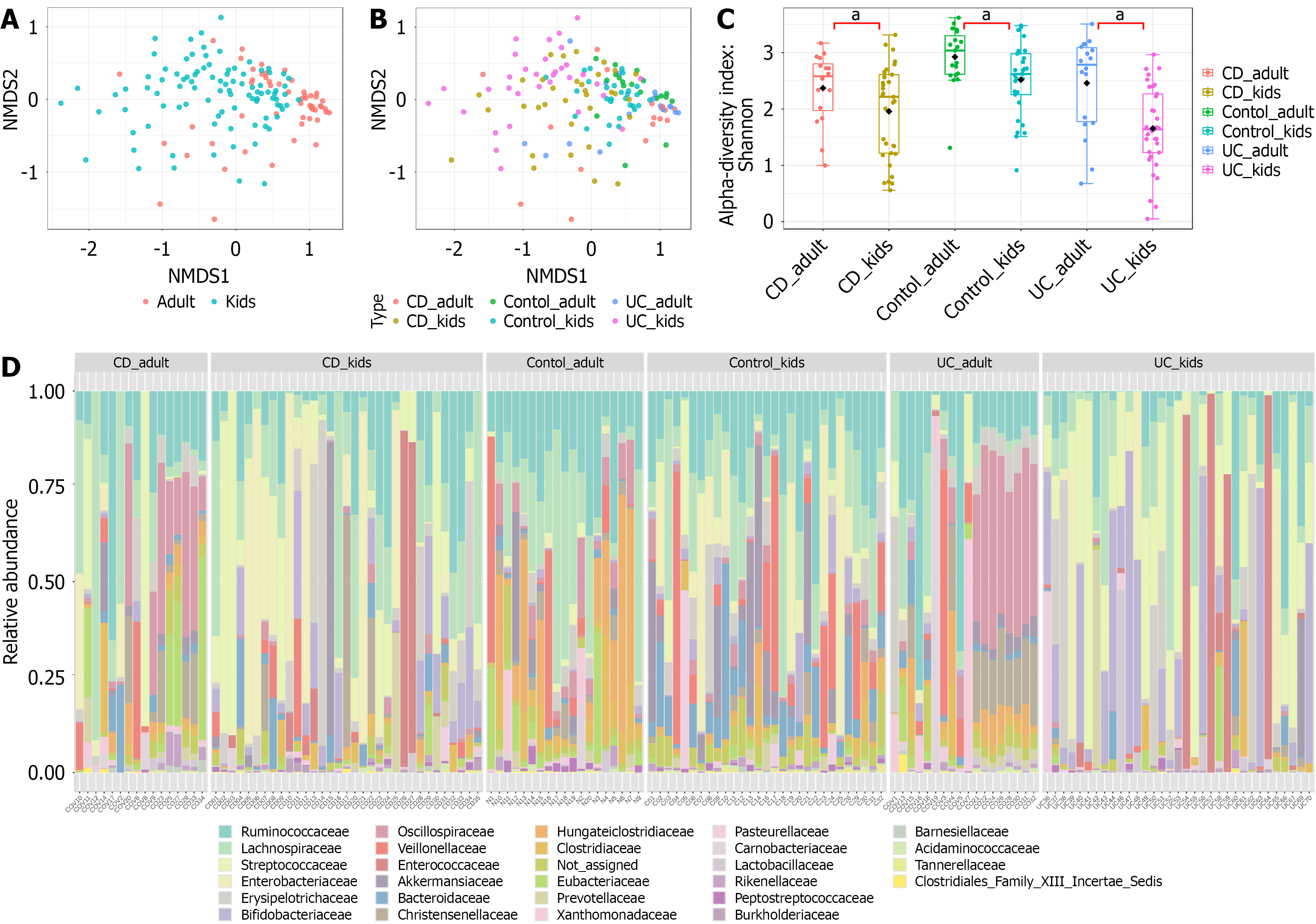 А and В: Nonmetric multidimensional scaling based on Bray-Curtis dissimilarity; C: Boxplots representing Shannon’s alpha diversity index; D: Bar plots of bacterial family relative abundance. aP < 0.05, assessed by Kruskal-Wallis test. UC: Ulcerative colitis; CD: Crohn’s disease; NMDS2: Non-metric multidimensional scaling ordinate 2.