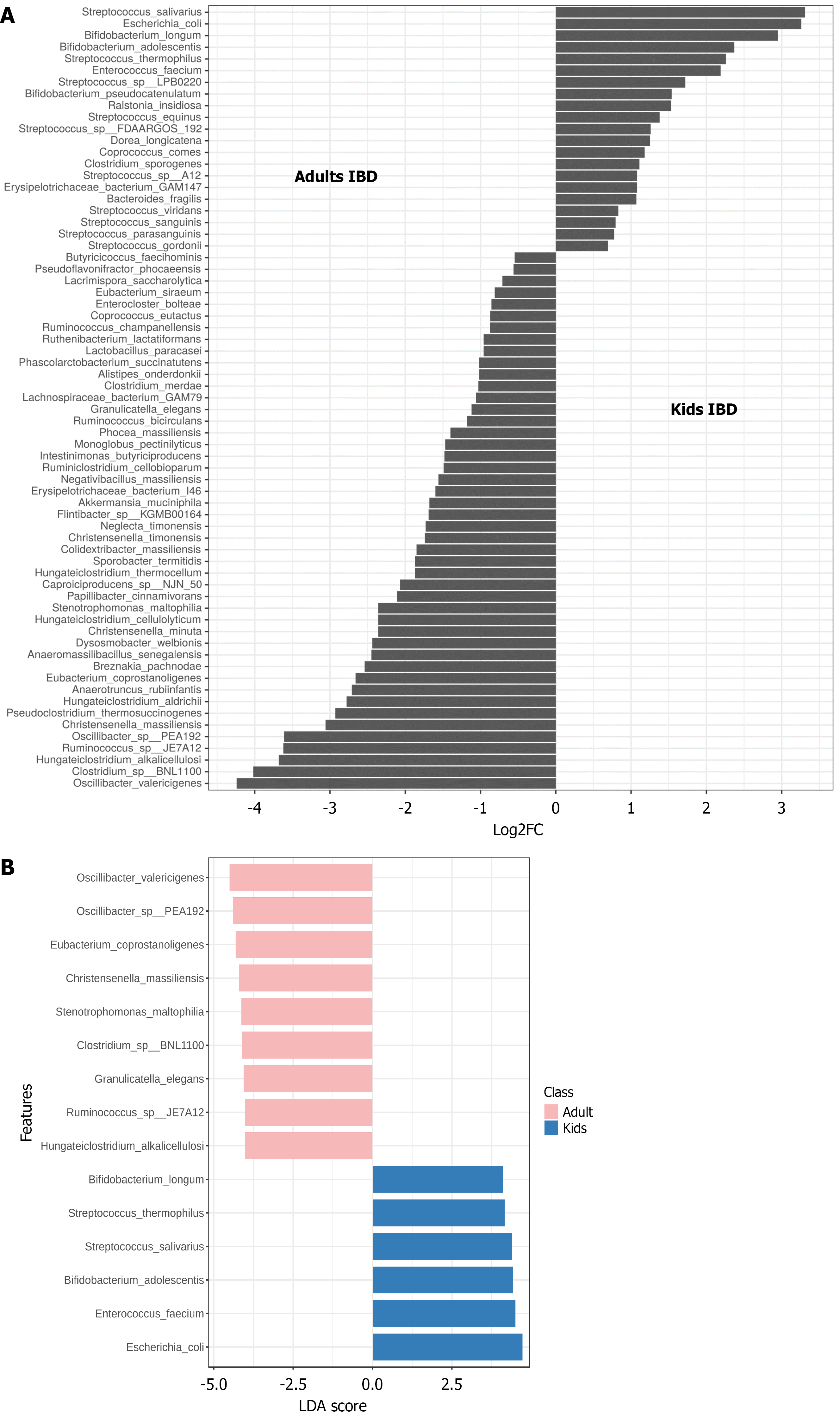A: Results of identifying differentially abundant species between pediatric and adult inflammatory bowel disease patient groups using Maalsin2 with the following thresholds: Minimum abundance = 0.01, minimum prevalence = 0.25, maximum significance = 0.05; B: Results of identifying biomarker species of pediatric and adult inflammatory bowel disease patient groups using linear discriminant analysis effect size. The colors indicate biomarker species for the studied groups. IBD: Inflammatory bowel disease; LDA: Linear discriminant analysis.