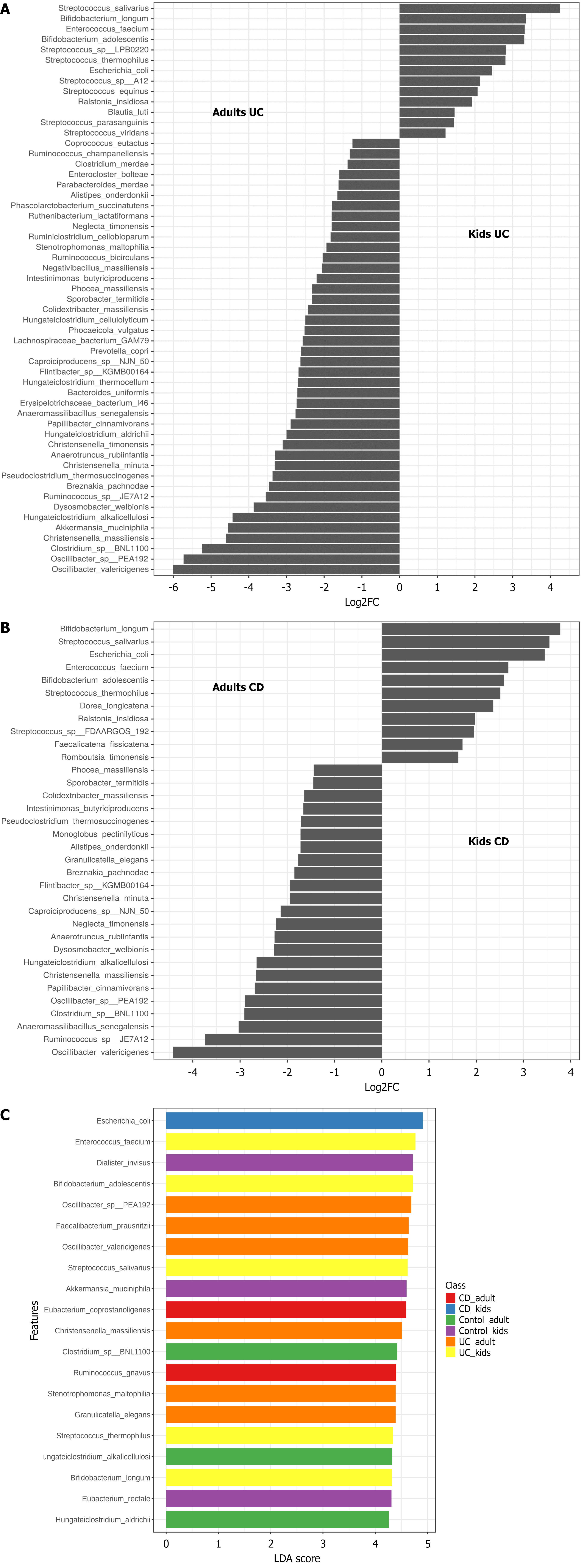A: Results of identifying differentially abundant species between pediatric and adult ulcerative colitis patient’s groups using Maalsin2 with following thresholds minimum abundance = 0.01, minimum prevalence = 0.25, max significance = 0.05; B: Results of identifying differentially abundant species between pediatric and adult Crohn’s disease patient’s groups using Maalsin2 with following thresholds minimum abundance = 0.01, minimum prevalence = 0.25, maximum significance = 0.05; C: Results of identifying biomarker species of pediatric and adult controls, ulcerative colitis and Crohn’s disease patient’s groups using linear discriminant analysis effect size. The colors indicate biomarker species for the studied groups. UC: Ulcerative colitis; CD: Crohn’s disease; LDA: Linear discriminant analysis.