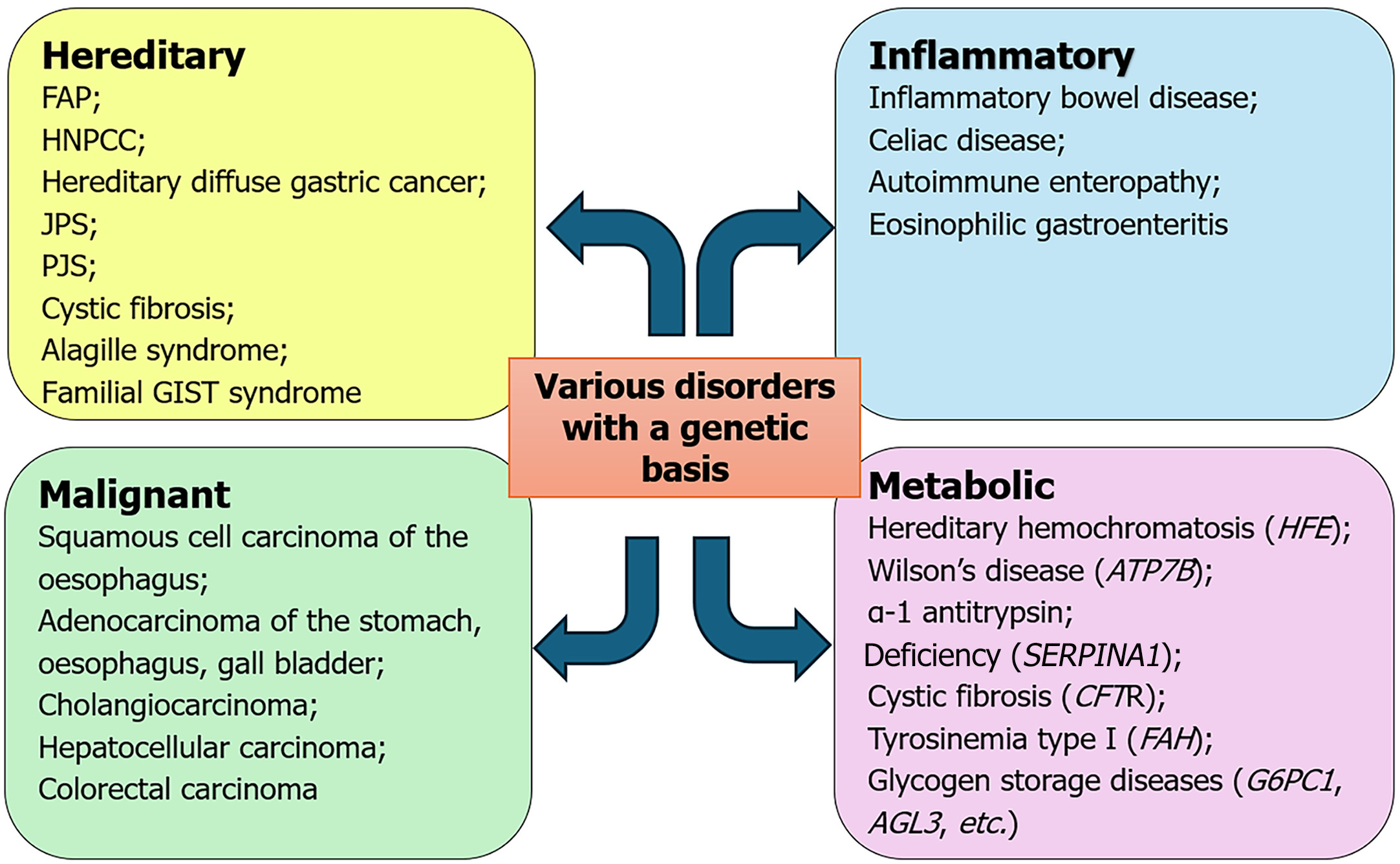 FAP: Familial adenomatous polyposis; HNPCC: Hereditary non-polyposis colorectal cancer; JPS: Juvenile polyposis syndrome; PJS: Peutz-Jeghers syndrome; GIST: Gastrointestinal stromal tumor.