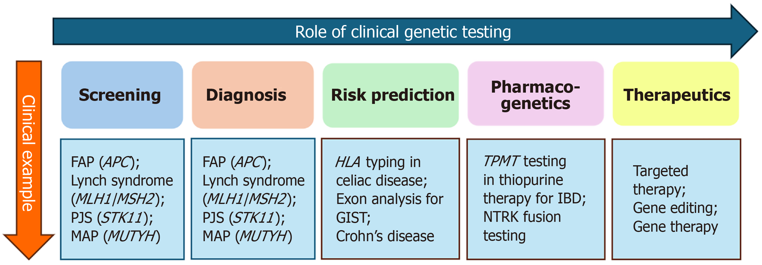 FAP: Familial adenomatous polyposis; PJS: Peutz-Jeghers syndrome; MAP: MUTYH-associated polyposis; GIST: Gastrointestinal stromal tumor; IBD: Inflammatory bowel disease; NTRK: Neurotrophic tyrosine receptor kinase.