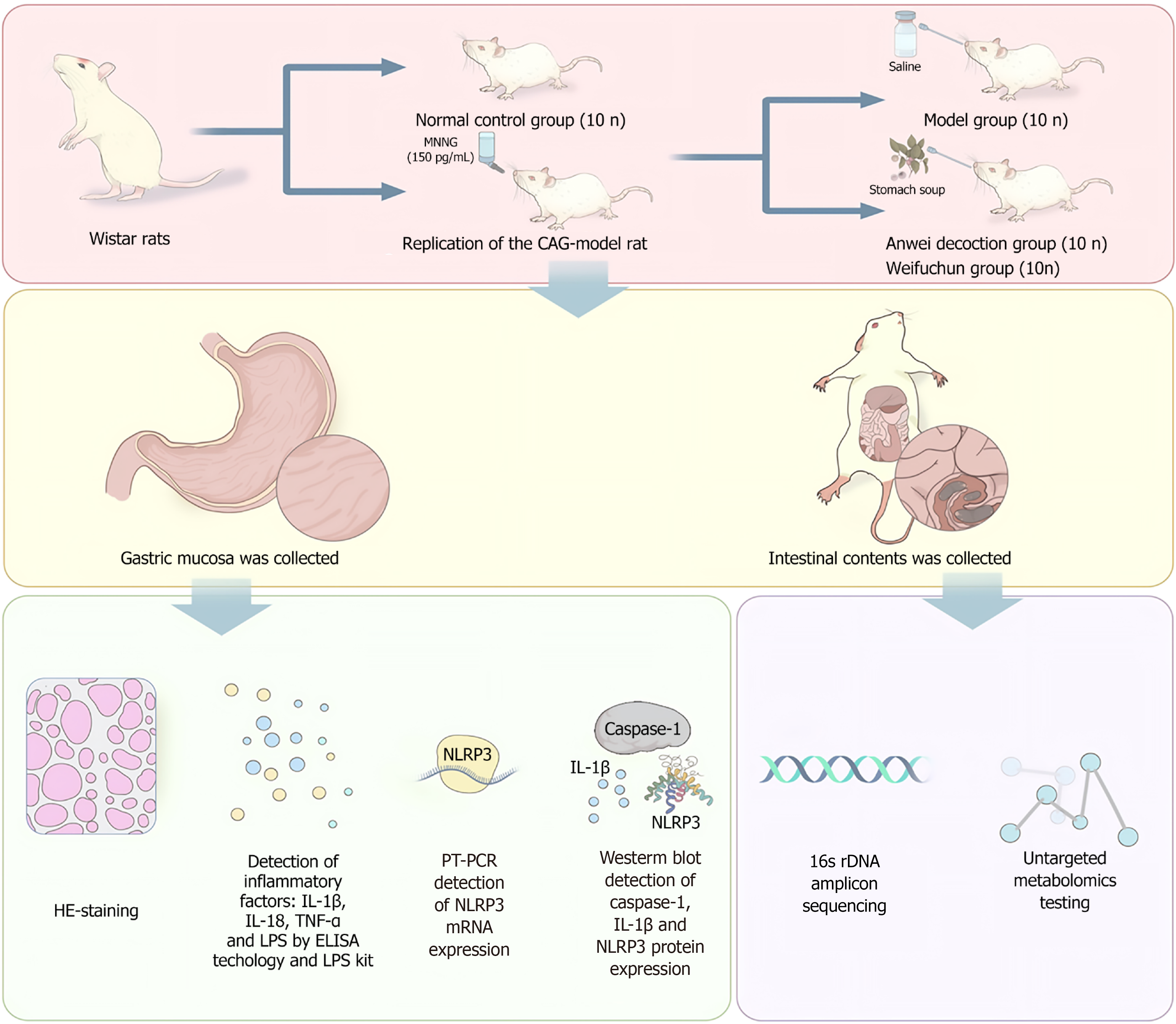 The remaining rats underwent chronic atrophic gastritis model induction. Upon successful modeling, rats were randomly divided into the model group receiving saline gavage, the Anwei decoction (AWD) intervention group receiving AWD (10.71 g/kg) and the Weifuchun capsules (WFC) intervention group (receiving WFC at 0.43 g/kg) daily for 8 weeks. The normal control group was provided regular feeding and drinking water free. CAG: Chronic atrophic gastritis; MNNG: N-methyl-N’-nitro-N-nitrosoguanidine; HE: Hematoxylin-eosin; IL: Interleukin; TNF: Tumor necrosis factor; LPS: Lipopolysaccharide; ELISA: Enzyme-linked immunosorbent assay; qRT-PCR: Quantitative real-time polymerase chain reaction; mRNA: Messenger RNA.