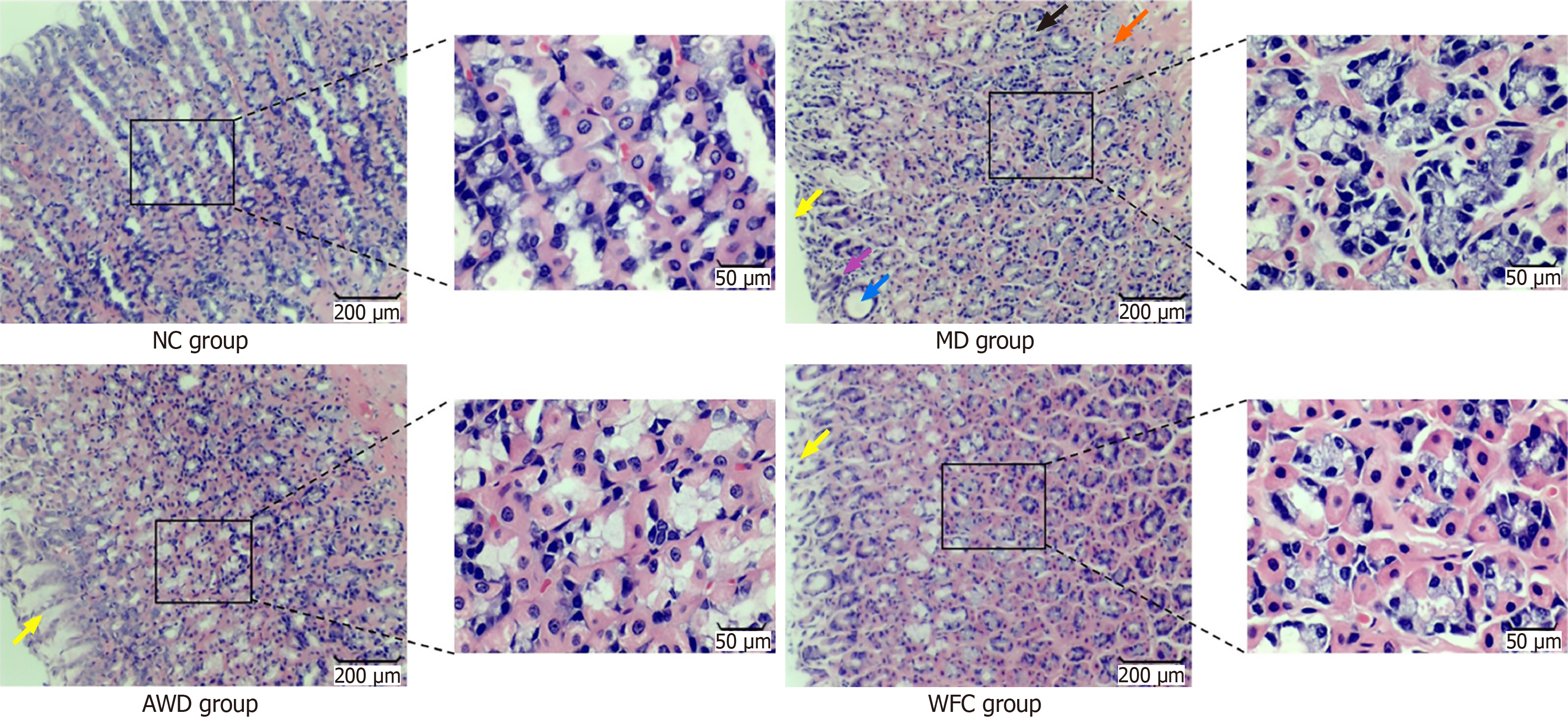 Detachment of gastric mucosal epithelial cells (yellow arrow); dilation of gastric glands (blue arrow); atrophy or reduction of gastric glands (black arrow); hyperplasia of fibrous connective tissue (orange arrow); inflammatory cell infiltration (purple arrow). The black square indicates the location of the magnified field. NC: Normal control; MD: Model; AWD: Anwei decoction; WFC: Weifuchun capsules.