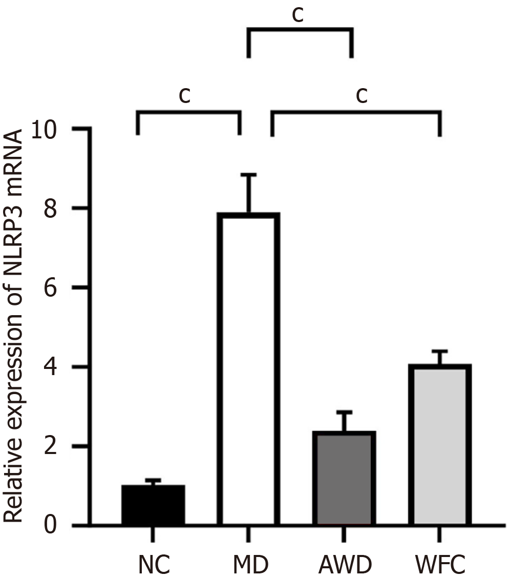 Compared with the normal control group and compared with the model group. cP < 0.001. mRNA: Messenger RNA; NC: Normal control; MD: Model; AWD: Anwei decoction; WFC: Weifuchun capsules.