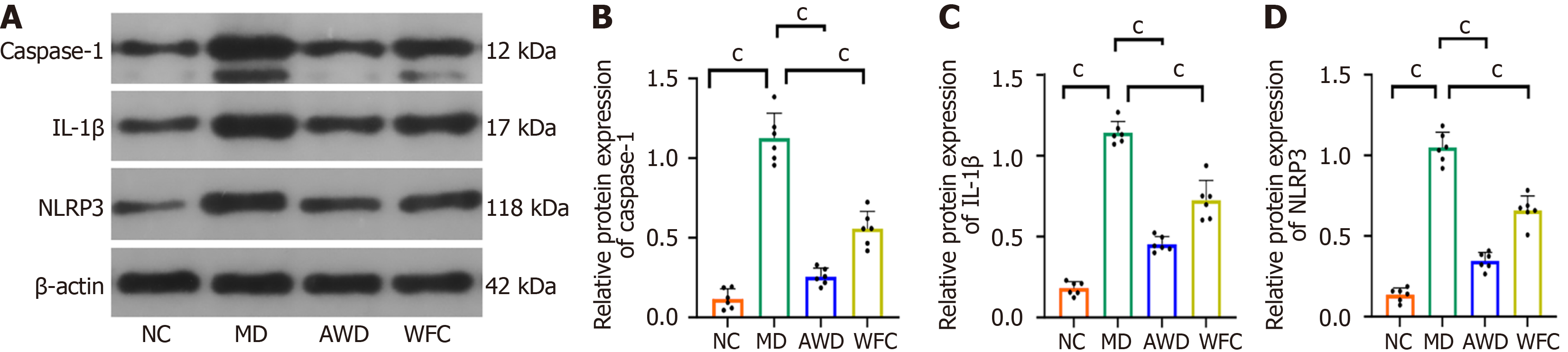 A: Western blot detection results of NLRP3 inflammasome-related protein expression levels in each group of cells; B: Protein expression levels of caspase-1; C: Protein expression levels of interleukin-1β; D: Protein expression levels of NLRP3. Compared with the normal control group and compared with the model group. cP < 0.001. IL: Interleukin; NC: Normal control; MD: Model; AWD: Anwei decoction; WFC: Weifuchun capsules.