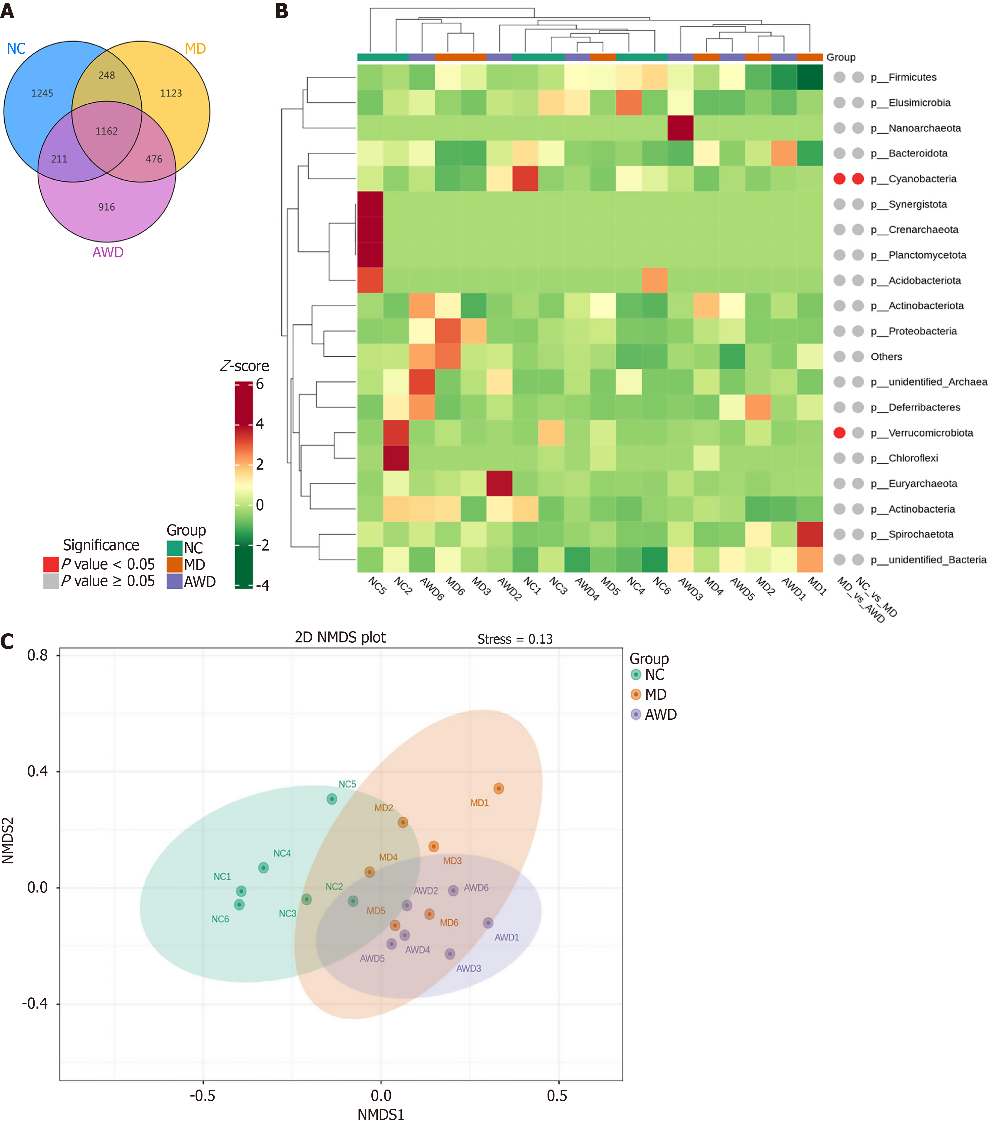 A: Venn diagram; B: Heatmap integrated with Metastats significance markers, displaying differences in microbial composition determined by 16S rRNA amplicon sequencing; C: Non-metric multidimensional scaling analysis results. NC: Normal control; MD: Model; AWD: Anwei decoction; NMDS: Non-metric multidimensional scaling.