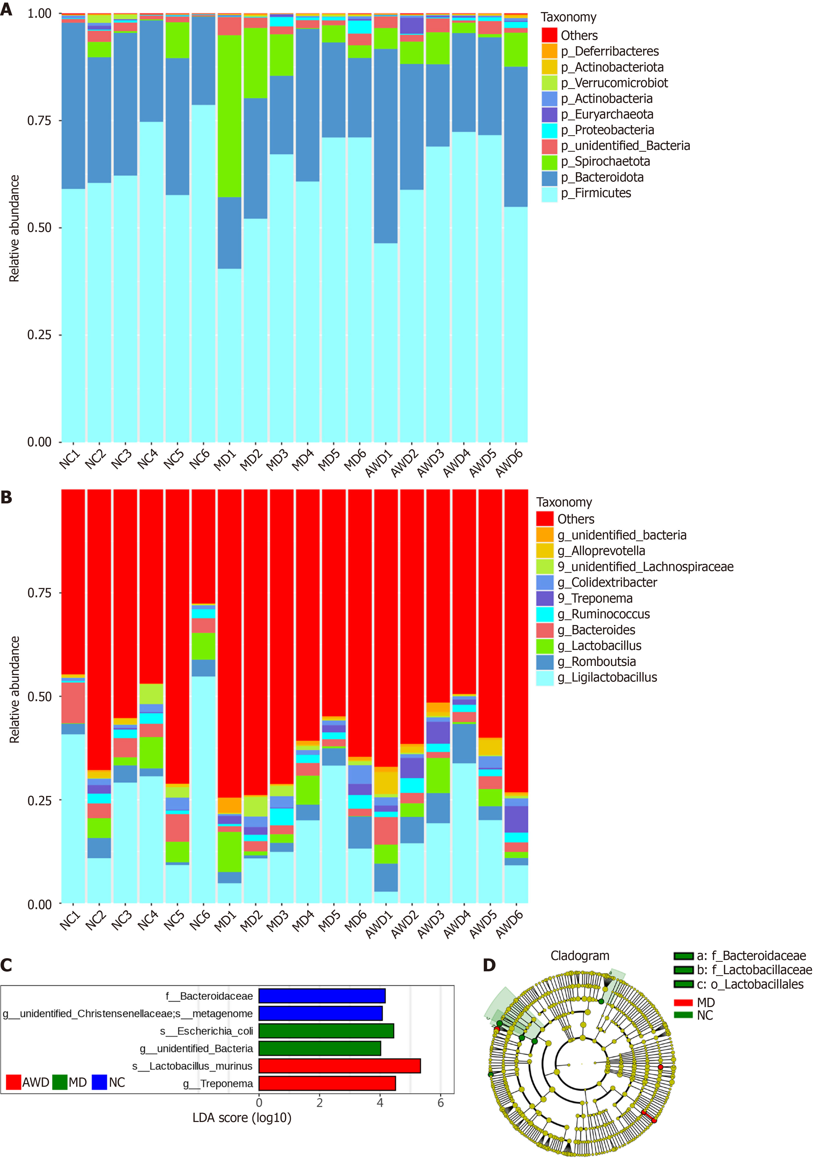 A: Relative abundance of microbial taxa at the phylum level; B: Relative abundance of microbial taxa at the genus level; C: Linear discriminant analysis score distribution indicating microbial taxa significantly differing among groups; D: Taxonomic cladogram illustrating taxa with significant differences among groups. NC: Normal control; MD: Model; AWD: Anwei decoction; LDA: Linear discriminant analysis.
