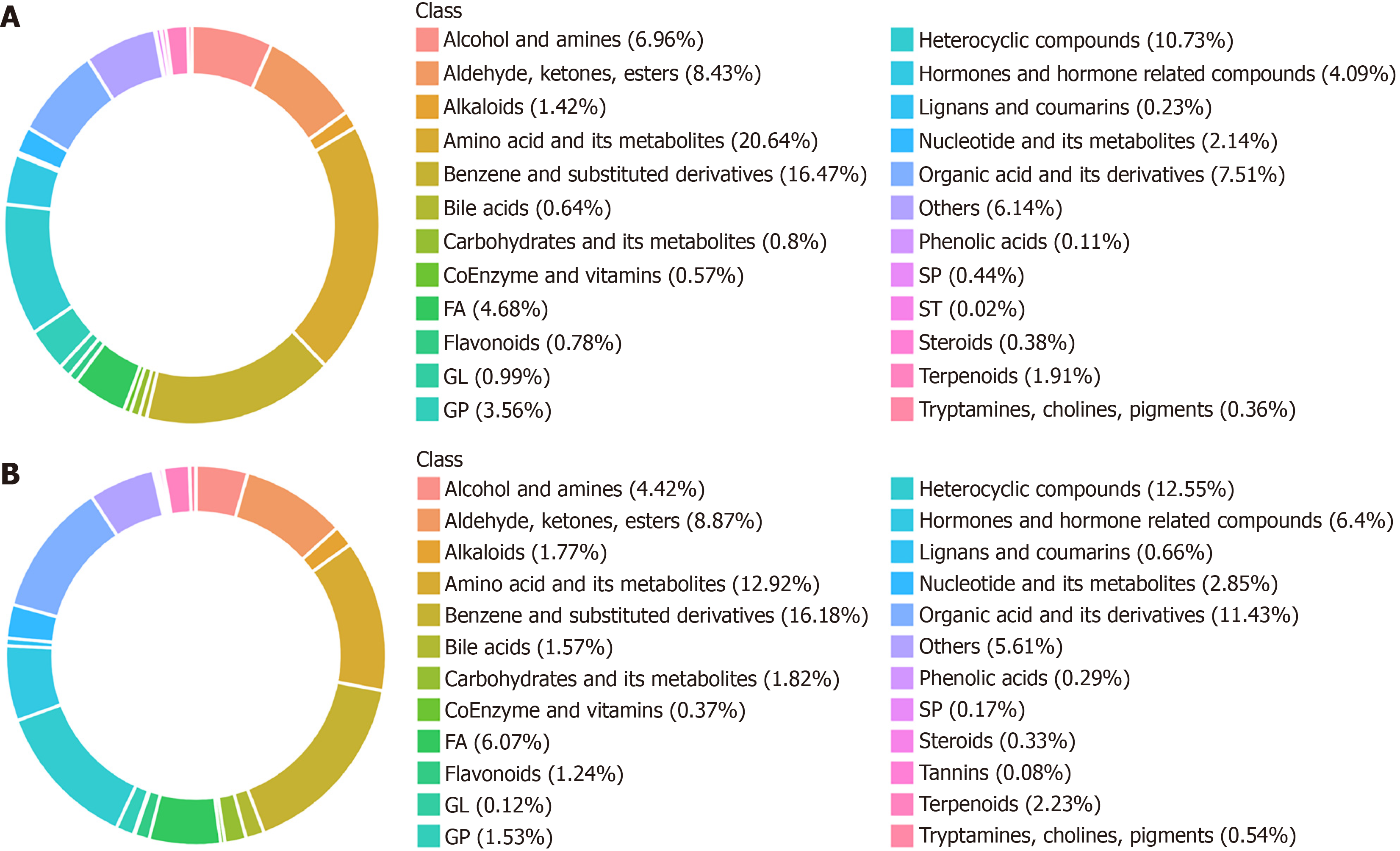 A: Positive-ion metabolites; B: Negative-ion metabolites. FA: Fatty acids; GL: Glycerolipids; GP: Glycerophospholipids; SP: Sphingolipids; ST: Steroid.
