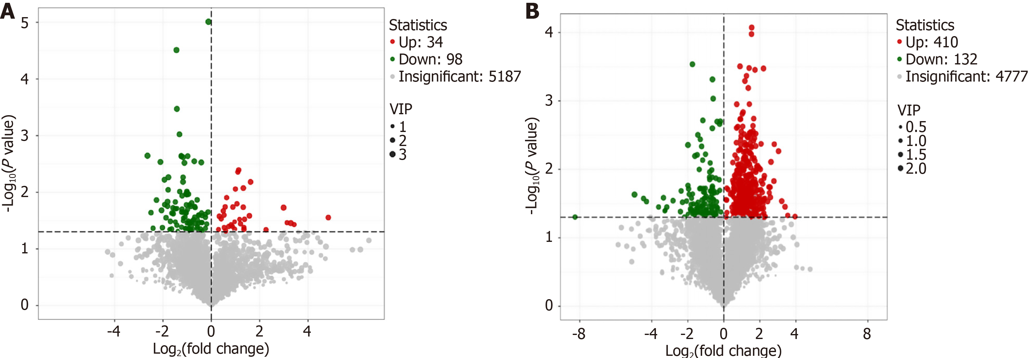 A: Model group vs normal control group; B: Anwei decoction group vs model group. Each dot represents a metabolite, with green dots indicating downregulated metabolites, red dots indicating upregulated metabolites, and gray dots indicating metabolites with no significant difference. VIP: Variable importance in projection.