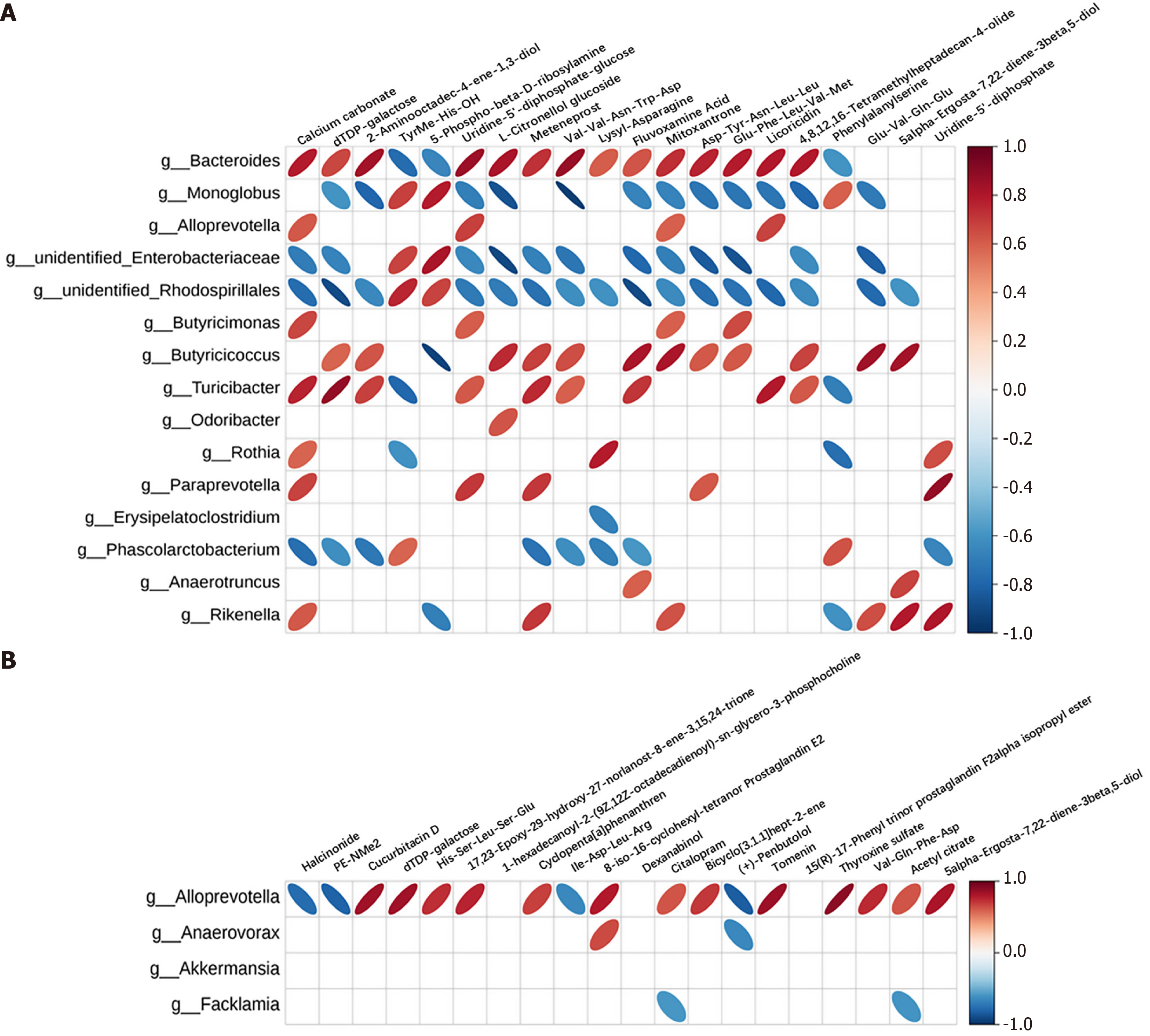 A: Correlation heatmap of top 20 differential metabolites and microorganisms (model group vs normal control group); B: Correlation heatmap of top 20 differential metabolites and microorganisms (Anwei decoction group vs model group). In the correlation heatmap, microorganisms are represented by rows, while metabolites correspond to columns. Positive correlations are indicated by red ellipses, whereas negative correlations are shown with blue ellipses. Ellipse narrowness reflects correlation strength, with narrower ellipses denoting stronger associations. Cells lacking ellipses represent correlations that were not statistically significant (P > 0.05).