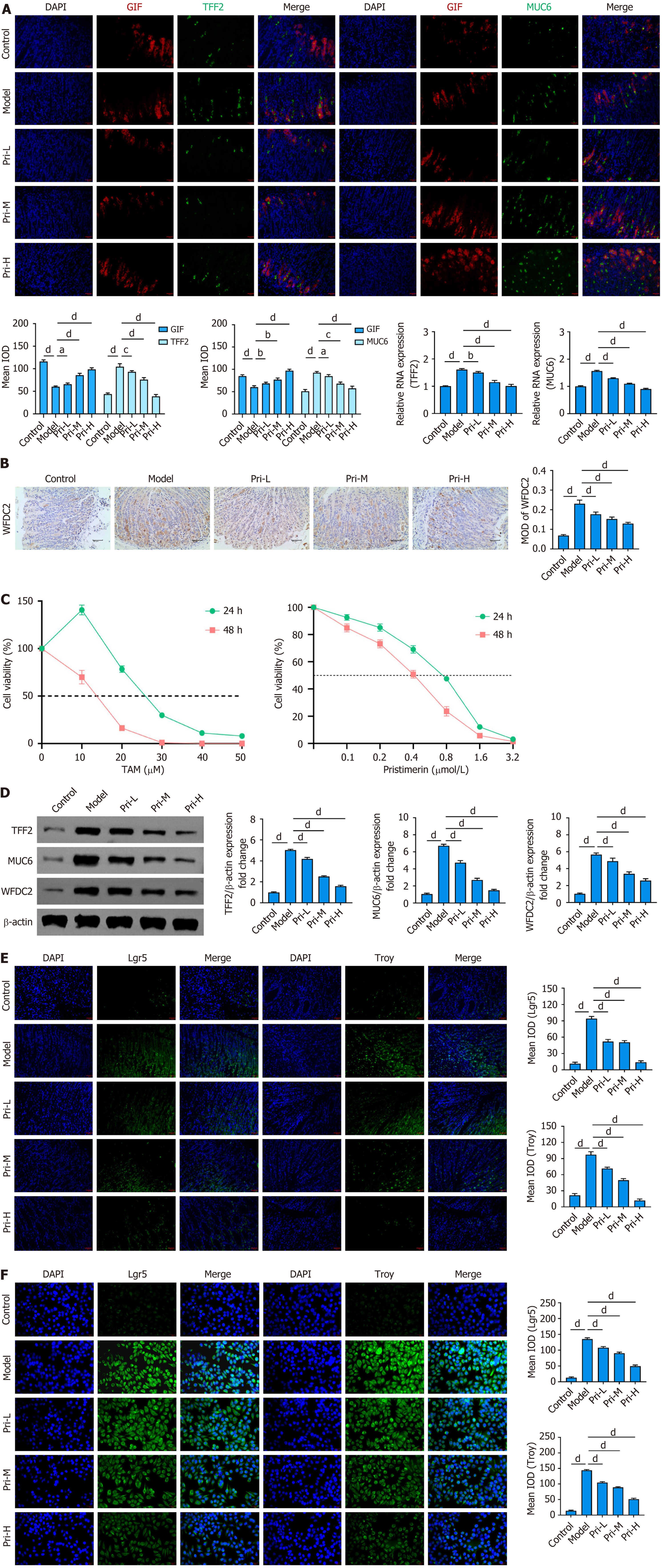 A: Immunofluorescence co-localization analysis of chief cell marker gastric intrinsic factor with spasmolytic polypeptide-expressing metaplasia (SPEM)-specific markers trefoil factor 2 (TFF2)/mucin 6 (MUC6) in mouse gastric tissues, and detection of TFF2/MUC6 expression by reverse transcription qua ntitative polymerase chain reaction in mouse stomach. Scale bar, 20 μm; B: Expression of SPEM-specific marker whey-acidic-protein four-disulfide core domain protein 2 (WFDC2) in mouse gastric tissues. Scale bar, 100 μm; C: 3-(4,5-dimethylthiazol-2-yl)-2,5-diphenyltetrazolium bromide assay of human gastric epithelial (GES-1) cells viability treated with varying concentrations of tamoxifen or pristimerin; D: Western blot analysis of SPEM-specific markers (TFF2/MUC6/WFDC2) in GES-1 cells with β-actin-normalized quantification (vs control); E and F: Inhibitory effect of pristimerin on stem cell markers leucine-rich repeat-containing G-protein coupled receptor 5 and tumor necrosis factor receptor superfamily member 19 in gastric mucosa of SPEM mice (E) and GES-1 cells (F). Scale bar, 20 μm. aP < 0.05; bP < 0.01; cP < 0.001; dP < 0.0001. Values represent the mean ± SD (A, B and E: n = 6; C, D and F: n = 5). DAPI: 4’,6-diamidino-2-phenylindole; GIF: Gastric intrinsic factor; Pri-L: Low-dose pristimerin; Pri-M: Medium-dose pristimerin; Pri-H: High-dose pristimerin; IOD: Integrated optical density; MUC6: Mucin 6; TAM: Tamoxifen; TFF2: Trefoil factor 2; WFDC2: Whey-acidic-protein four-disulfide core domain protein 2; MOD: Mean optical density; Lgr5: Leucine-rich repeat-containing G-protein coupled receptor 5; Troy: Tumor necrosis factor receptor superfamily member 19.