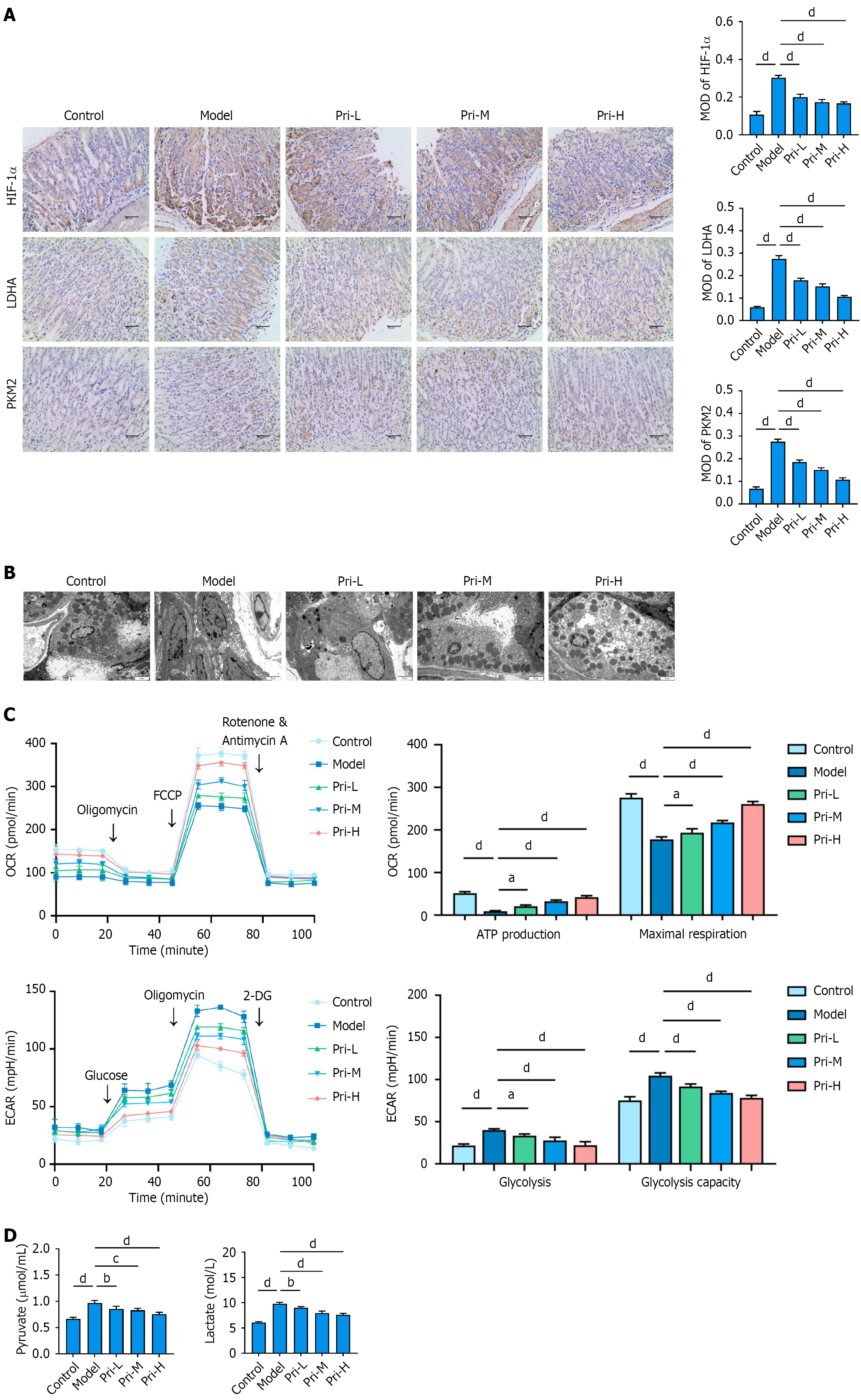 A: Inhibitory effects of pristimerin on key glycolytic regulators (hypoxia-inducible factor-1α, lactate dehydrogenase A, pyruvate kinase M2) in the gastric mucosa of mice. Scale bar, 100 μm; B: Representative transmission electron microscopy images revealing ultrastructural features in mouse gastric mucosal cells. Scale bar, 2 μm; C: Analysis of cellular energy metabolism by Seahorse XF technology in human gastric epithelial (GES-1) cells following treatment with pristimerin; D: Quantitative analysis of pyruvate and lactate production in GES-1 cells. aP < 0.05. bP < 0.01. cP < 0.001. dP < 0.0001. Values represent the mean ± SD (A: n = 6; C and D: n = 5). HIF-1α: Hypoxia-inducible factor-1α; LDHA: Lactate dehydrogenase A; PKM2: Pyruvate kinase M2; Pri-L: Low-dose pristimerin; Pri-M: Medium-dose pristimerin; Pri-H: High-dose pristimerin; MOD: Mean optical density; FCCP: Trifluoromethoxy carbonylcyanide phenylhydrazone; 2-DG: 2-deoxy-D-glucose; OCR: Oxygen consumption rate; ECAR: Extracellular acidification rate.