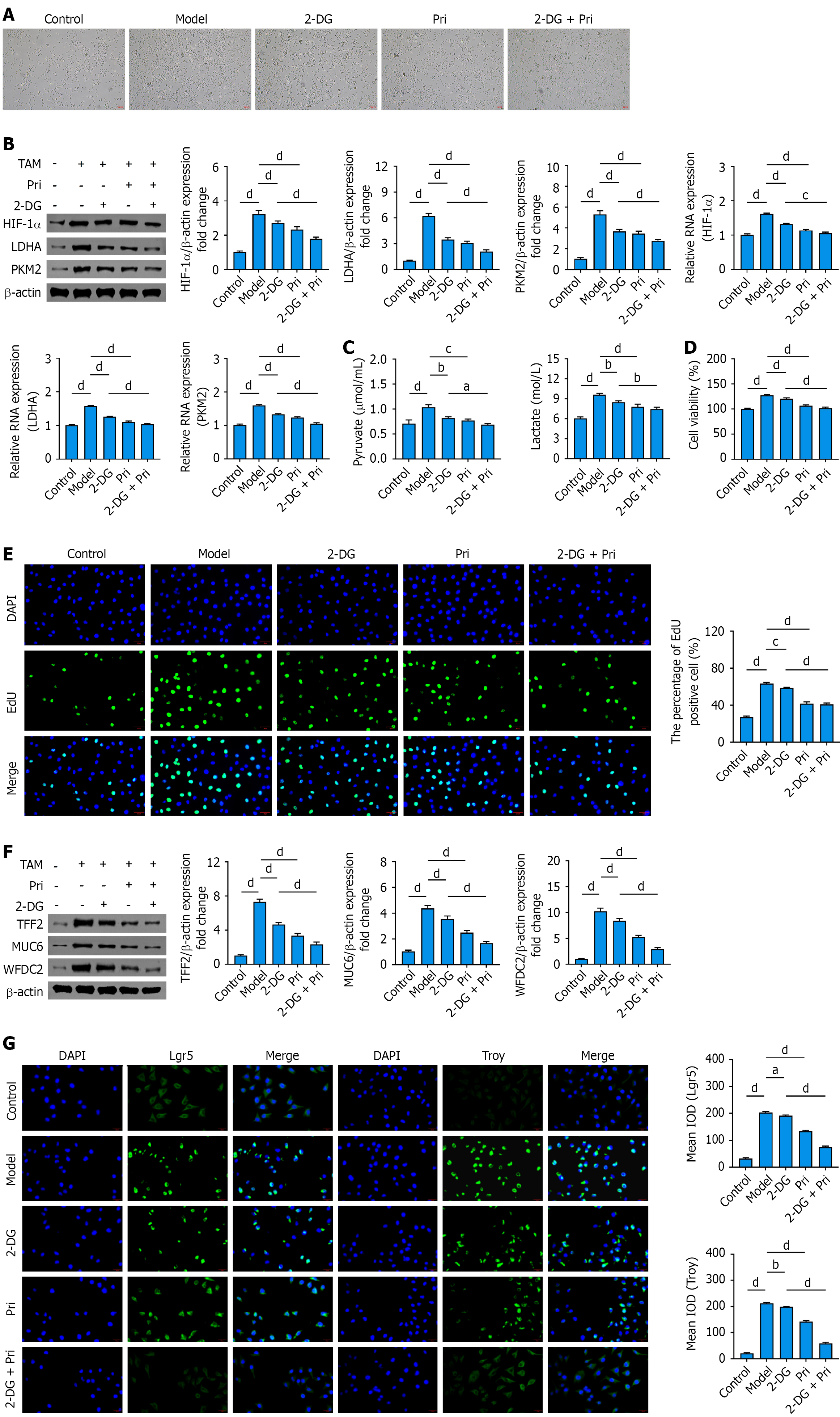 A: Representative images of tamoxifen-induced human gastric epithelial (GES-1) cells following pristimerin or 2-deoxy-D-glucose (2-DG) intervention. Scale bar, 100 μm; B: Expression of key glycolytic regulators in GES-1 cells following pristimerin or 2-DG intervention; C: Quantitative analysis of pyruvic acid and lactate production in GES-1 cells; D: 3-(4,5-dimethylthiazol-2-yl)-2,5-diphenyltetrazolium bromide assay for GES-1 cell viability; E: 5-Ethynyl-2’-deoxyuridine assay for detecting proliferation activity in GES-1 cells. Scale bar, 20 μm; F: Inhibitory effects of pristimerin or 2-DG on spasmolytic polypeptide-expressing metaplasia-specific marker expression in GES-1 cells (Western blot; β-actin-normalized relative expression vs control); G: Expression of stem cell markers in GES-1 cells following pristimerin or 2-DG treatment. Scale bar, 20 μm. aP < 0.05. bP < 0.01. cP < 0.001. dP < 0.0001. Values represent the mean ± SD (n = 5). 2-DG: 2-deoxy-D-glucose; Pri: Pristimerin; HIF-1α: Hypoxia-inducible factor-1α; LDHA: Lactate dehydrogenase A; PKM2: Pyruvate kinase M2; TAM: Tamoxifen; DAPI: 4’,6-diamidino-2-phenylindole; EdU: 5-Ethynyl-2’-deoxyuridine; MUC6: Mucin 6; TFF2: Trefoil factor 2; WFDC2: Whey-acidic-protein four-disulfide core domain protein 2; Lgr5: Leucine-rich repeat-containing G-protein coupled receptor 5; Troy: Tumor necrosis factor receptor superfamily member 19; IOD: Integrated optical density.