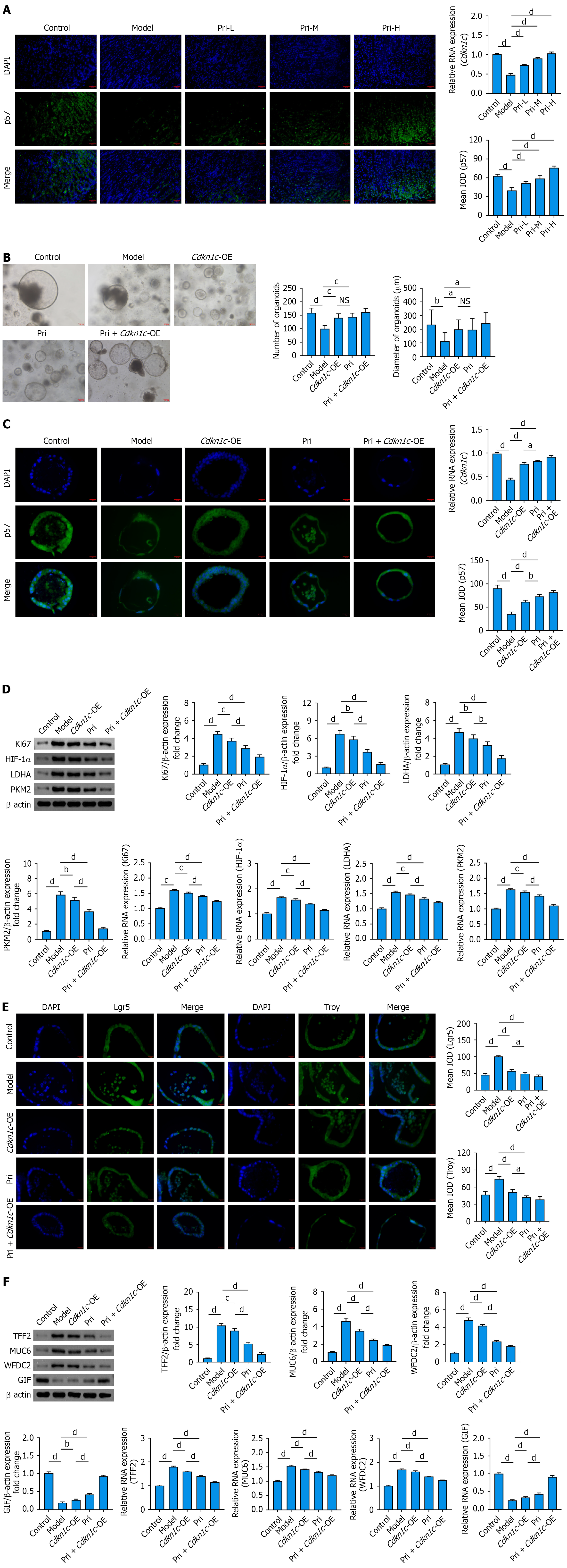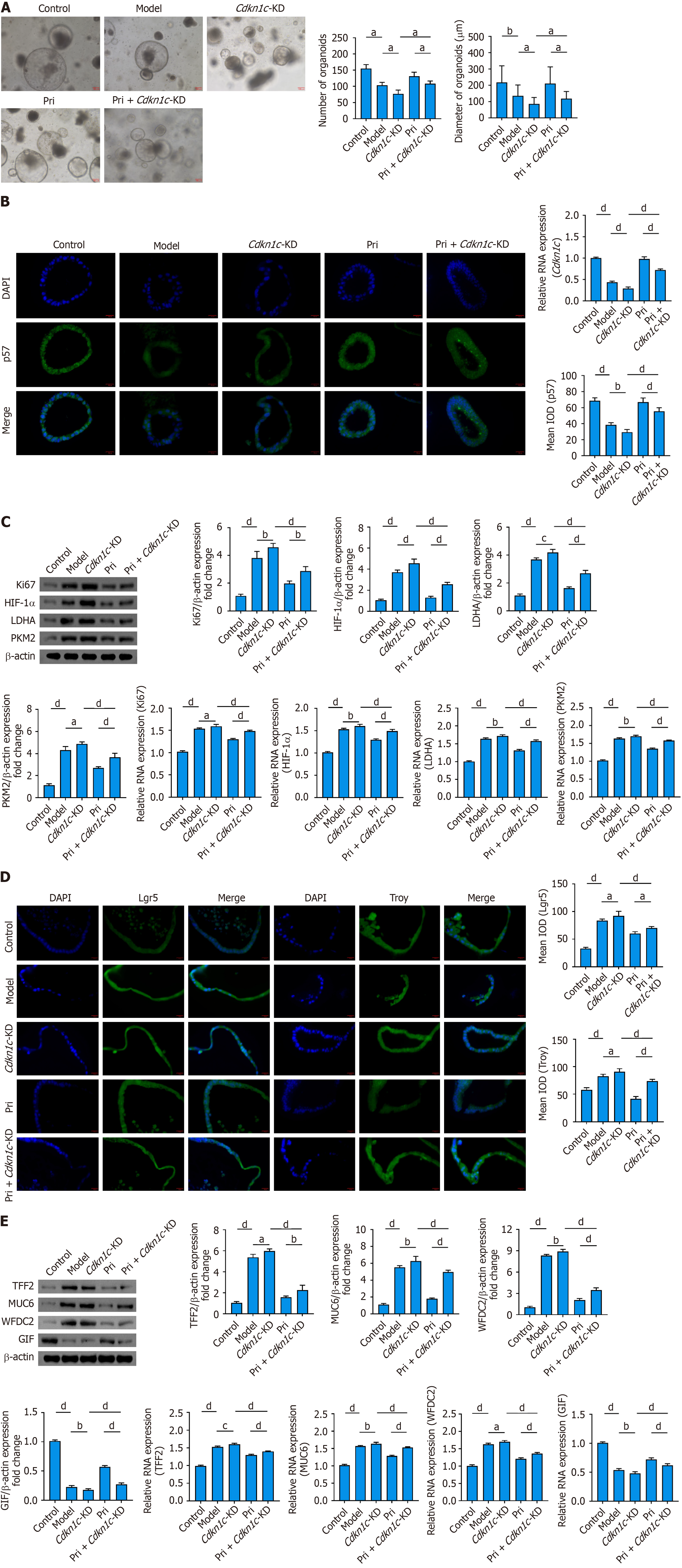 A: Representative images of normal gastric organoids, N-methyl-N’-nitro-N-nitrosoguanidine/Helicobacter pylori-induced spasmolytic polypeptide-expressing metaplasia (SPEM) gastric organoids, and those following Cdkn1c knockdown or pristimerin intervention, along with quantitative analyses of organoid number and diameter. Scale bar, 100 μm; B: Effects of Cdkn1c knockdown or pristimerin treatment on p57 expression levels in gastric organoids. Scale bar, 10 μm; C-E: Cdkn1c knockdown promotes cell proliferation [reverse transcription quantitative polymerase chain reaction (RT-qPCR); Western blot, β-actin-normalized relative expression vs control] and enhances the expression of key glycolytic regulators (RT-qPCR; Western blot), stem cell markers (immunofluorescence: Scale bar, 10 μm), and SPEM-specific markers (RT-qPCR; Western blot) in SPEM gastric organoids, while suppressing gastric intrinsic factor (RT-qPCR; Western blot) expression. It also attenuates the regulatory effects of pristimerin on these phenotypes. aP < 0.05. bP < 0.01. cP < 0.001. dP < 0.0001. Values represent the mean ± SD (n = 5). Cdkn1c-KD: Cdkn1c-knockdown spasmolytic polypeptide-expressing metaplasia organoids; DAPI: 4’,6-diamidino-2-phenylindole; GIF: Gastric intrinsic factor; Pri: Pristimerin; IOD: Integrated optical density; HIF-1α: Hypoxia-inducible factor-1α; LDHA: Lactate dehydrogenase A; PKM2: Pyruvate kinase M2; MUC6: Mucin 6; TFF2: Trefoil factor 2; WFDC2: Whey-acidic-protein four-disulfide core domain protein 2; Lgr5: Leucine-rich repeat-containing G-protein coupled receptor 5; Troy: Tumor necrosis factor receptor superfamily member 19.