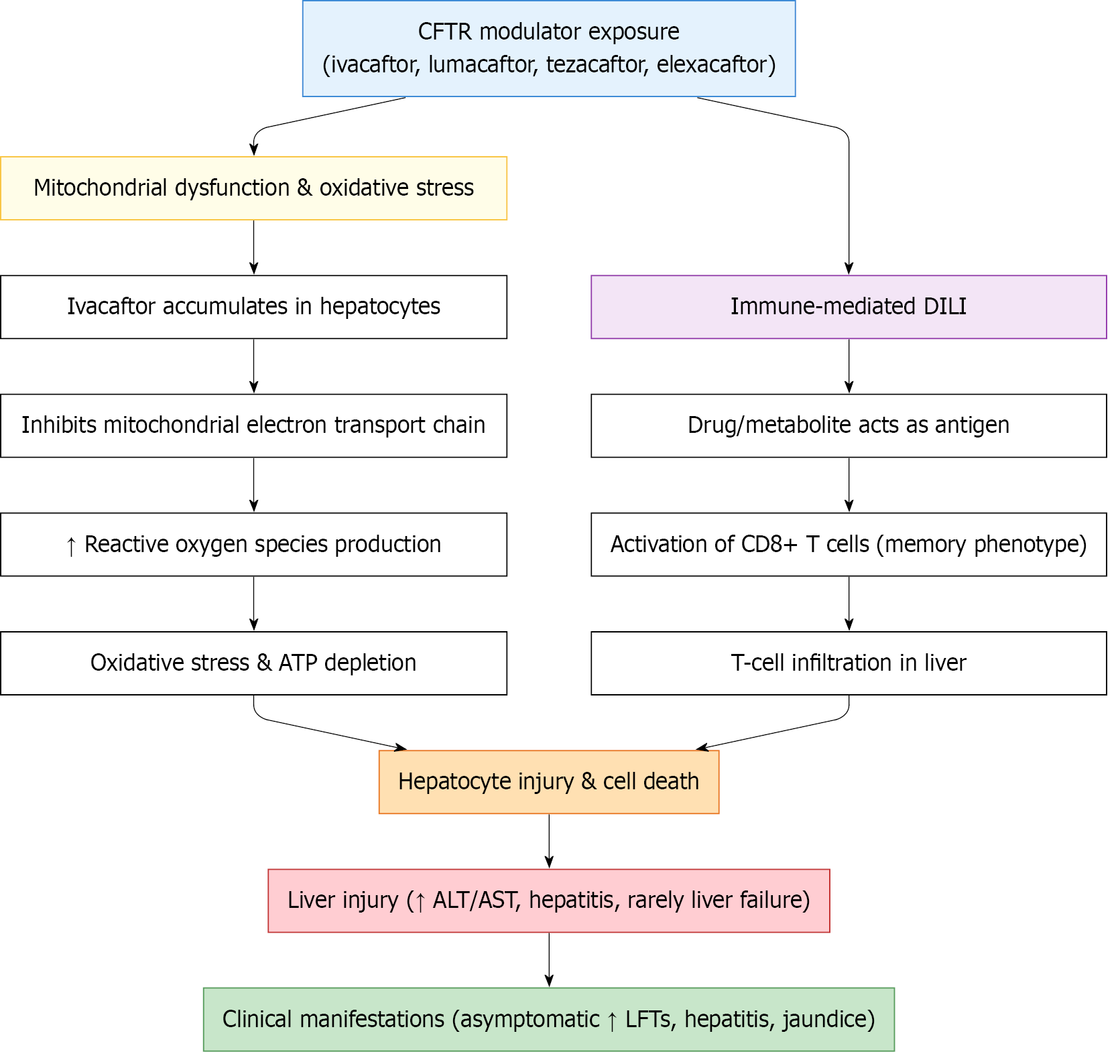 Figure 2 Mechanism of liver injury secondary to cystic fibrosis transmembrane conductance regulator modulator exposure.