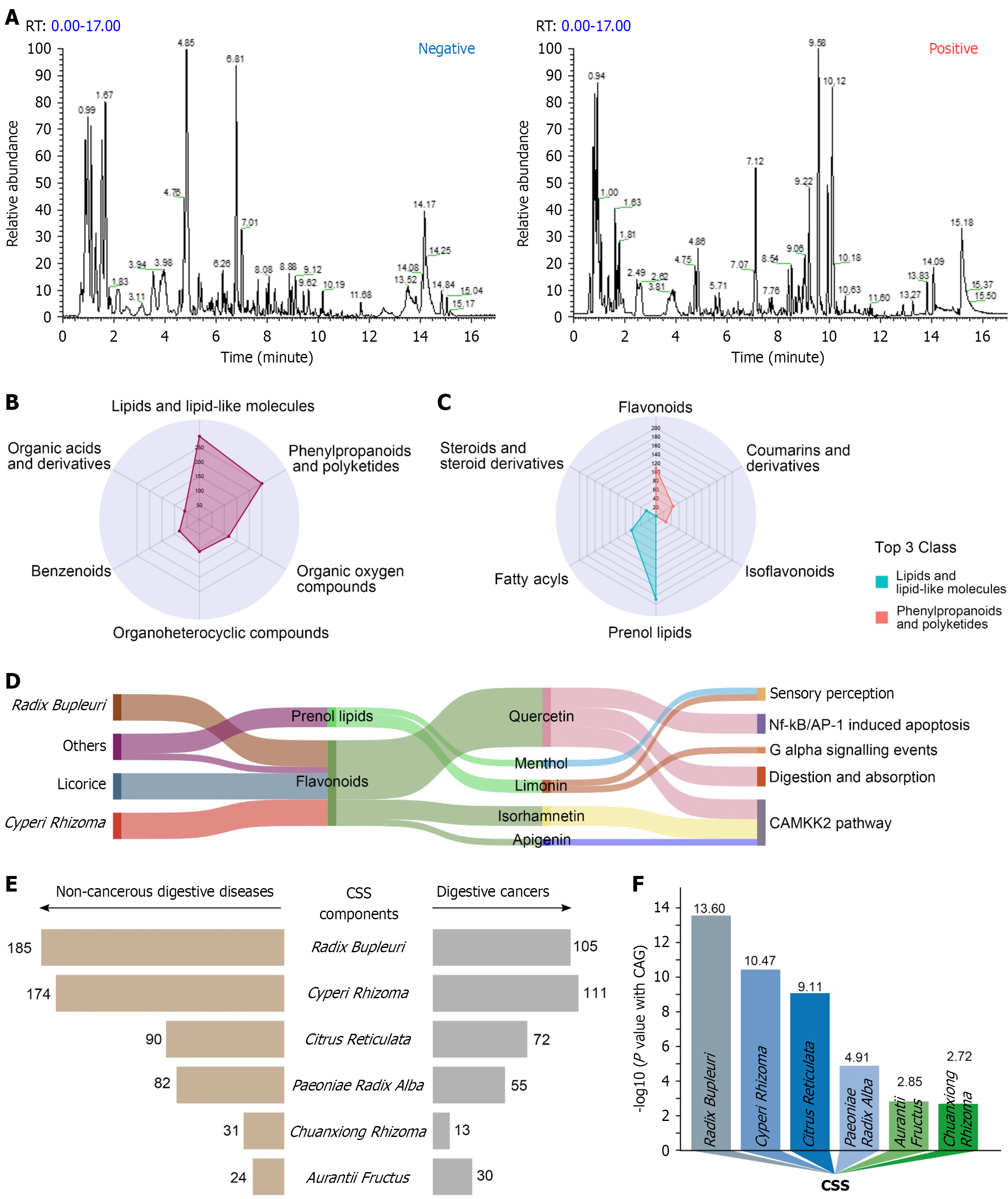 A: Mass spectra in positive and negative ion modes; B: Top six categories of active components in Chaihu-Shugan-San (CSS); C: Top three subclasses of lipids and lipid-like molecules, and phenylpropanoids and polyketides; D: Kyoto Encyclopedia of Genes and Genomes analysis of prenol lipids, and flavonoids; E: Number of digestive system diseases associated with the herbs in CSS; F: Relationship between the herbs in CSS and chronic atrophic gastritis. RT: Retention time; NF-κB: Nuclear factor-kappa B; AP-1: Activator protein-1; CAG: Chronic atrophic gastritis; CSS: Chaihu-Shugan-San.