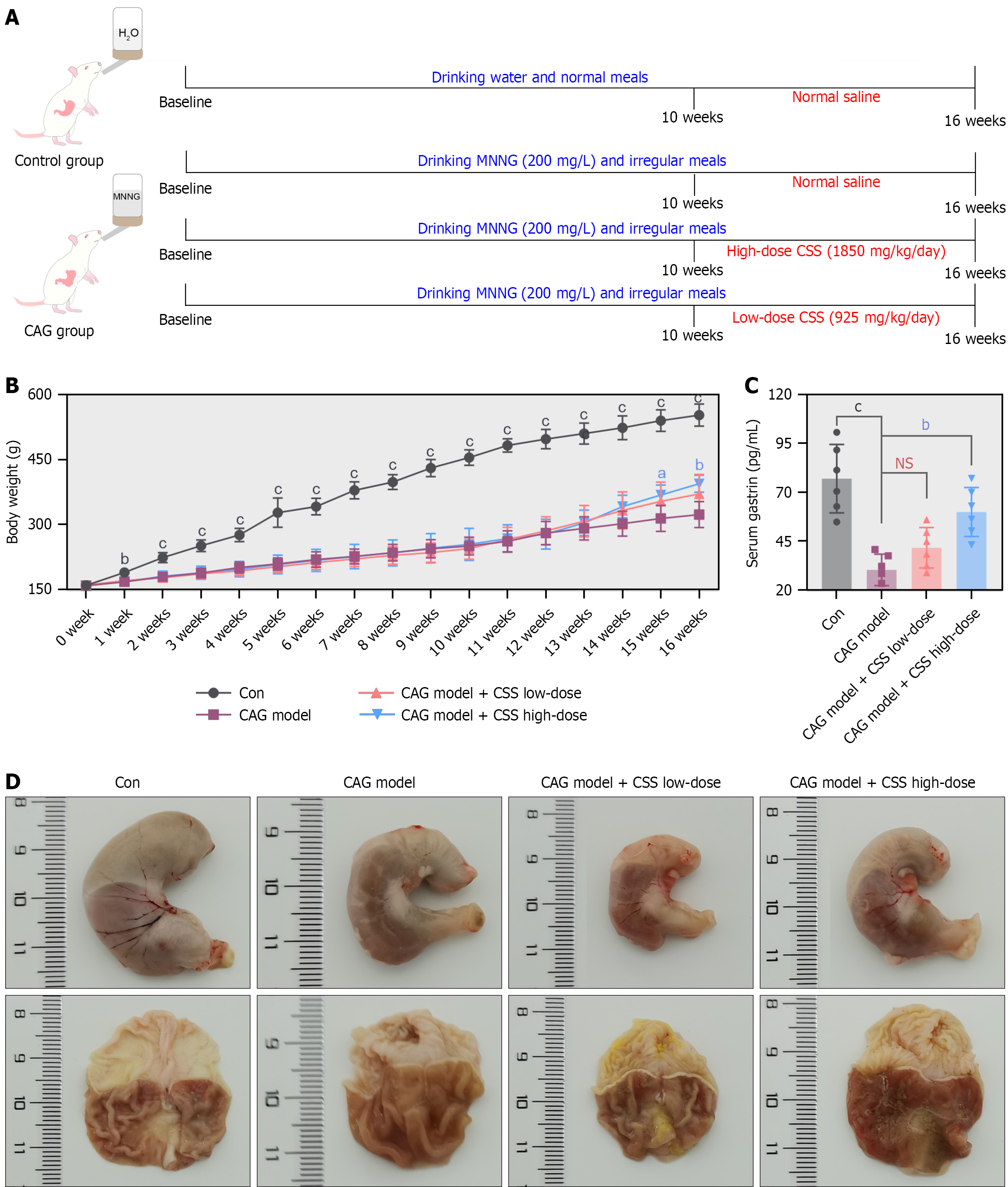 A: Schematic diagram; B: Body weight at different time points; C: Levels of gastrin in the serum of rats; D: Representative morphology of the stomach of rats. Upper, whole stomach. Lower, gastric mucosa after dissection. Data are shown as mean ± SD (n = 6). Differences were analyzed by one-way analysis of variance followed by Tukey’s post-hoc test. bP < 0.01. cP < 0.001. P values vs chronic atrophic gastritis model group. NS: No significance; H2O: Water; MNNG: N-methyl-N’-nitro-N-nitrosoguanidine; CAG: Chronic atrophic gastritis; CSS: Chaihu-Shugan-San; Con: Control.