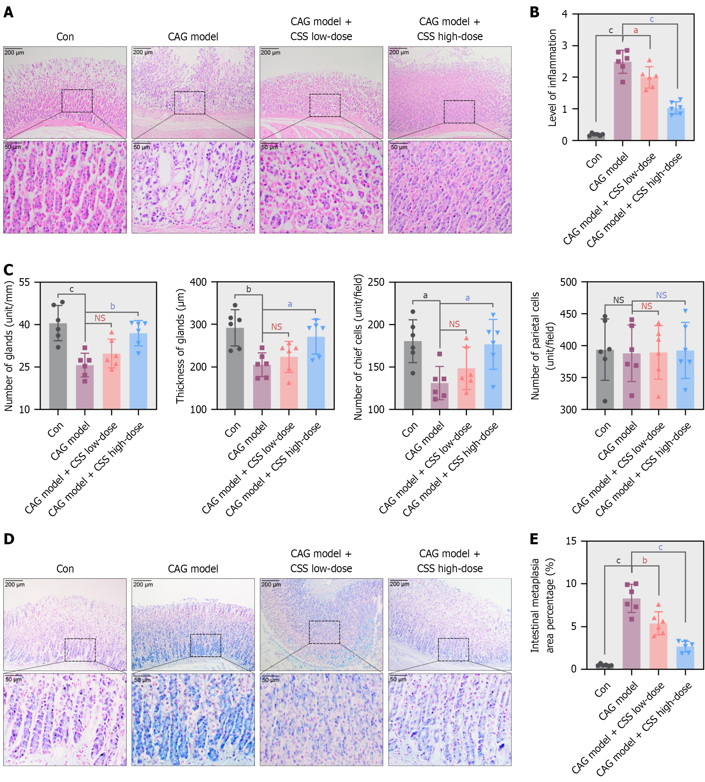 A: Representative photomicrographs for hematoxylin and eosin staining of the gastric mucosa of rats. Upper: Scale bar = 200 μm. Lower: Scale bar = 50 μm; B: Quantification of inflammation score; C: Quantitation of the number of gastric glands, thickness of gastric glands, number of gastric chief cells, and number of gastric parietal cells; D: Representative photomicrographs for alcian blue staining of the gastric mucosa. Upper: Scale bar = 200 μm. Lower: Scale bar = 50 μm; E: Quantitative analysis of intestinal metaplasia of gastric mucosa. Data are shown as mean ± SD (n = 6). Differences were analyzed by one-way analysis of variance followed by Tukey’s post-hoc test. aP < 0.05. bP < 0.01. cP < 0.001. P values vs chronic atrophic gastritis model group. NS: No significance; CAG: Chronic atrophic gastritis; CSS: Chaihu-Shugan-San; Con: Control.