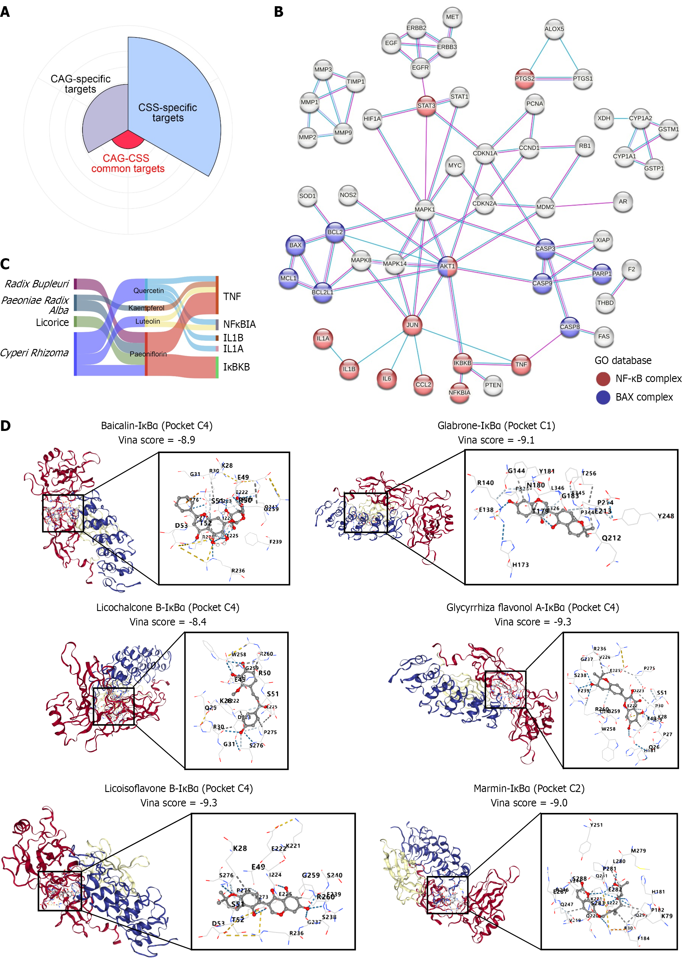 A: Pie chart of Chaihu-Shugan-San (CSS)-chronic atrophic gastritis common targets; B: Protein-protein interaction network. Interaction score > 0.9; C: Relationship between active components in CSS and key targets of the nuclear factor-kappa B pathway; D: Visualization of molecular docking of inhibitor of nuclear factor-kappa B protein with baicalin, glabrone, licochalcone B, glycyrrhiza flavonol A, licoisoflavone B, and marmin. CAG: Chronic atrophic gastritis; CSS: Chaihu-Shugan-San; GO: Gene Ontology; NF-κB: Nuclear factor-kappa B; TNF: Tumor necrosis factor; IL: Interleukin; IκB: Inhibitor of nuclear factor-kappa B.