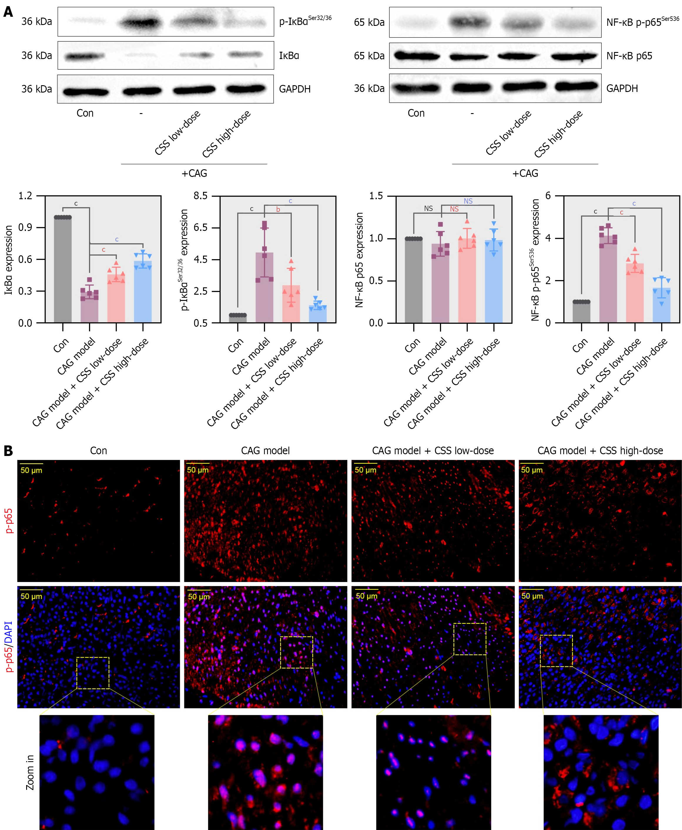 A: Upper: Western blotting examined the nuclear factor-kappa B signaling proteins inhibitor of nuclear factor-kappa B (IκBα), phospho (p)-IκBα, p65, and p-p65. Lower: Densitometric quantitation of proteins; B: Immunofluorescence detection of expression and nuclear localization of p-p65. Data are shown as mean ± SD (n = 6). Differences were analyzed by one-way analysis of variance followed by Tukey’s post-hoc test. bP < 0.01. cP < 0.001. P values vs chronic atrophic gastritis model group. NS: No significance; CAG: Chronic atrophic gastritis; CSS: Chaihu-Shugan-San; Con: Control; GAPDH: Glyceraldehyde-3-phosphate dehydrogenase; NF-κB: Nuclear factor-kappa B; IκB: Inhibitor of nuclear factor-kappa B; p: Phospho; DAPI: 4’,6-diamidino-2-phenylindole.