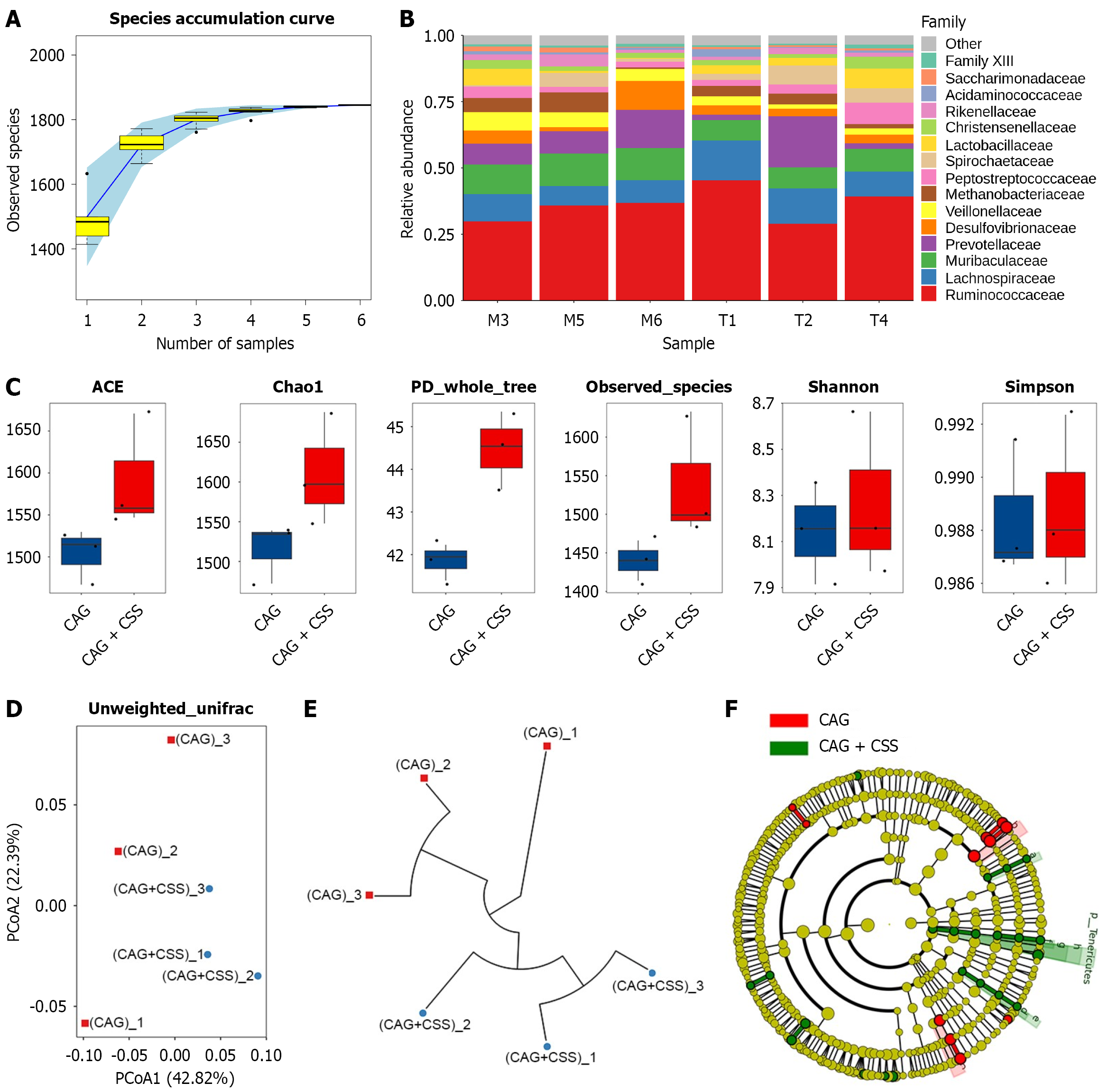 A: Species accumulation curve estimates the rationality of sequencing sample quantity; B: Community histogram shows the compositional discrepancy at family level; C: Analysis of differences in the α-diversity indexes ACE, Chao1, phylogenetic diversity whole tree, observed species, Shannon and Simpson; D and E: Analysis of differences in the β-diversity index, as determined by principal coordinate analysis (D) and hierarchical cluster tree (E); F: Cladogram of linear discriminant analysis effect size (n = 3). PD: Phylogenetic diversity; CAG: Chronic atrophic gastritis; CSS: Chaihu-Shugan-San; PCoA: Principal coordinates analysis.