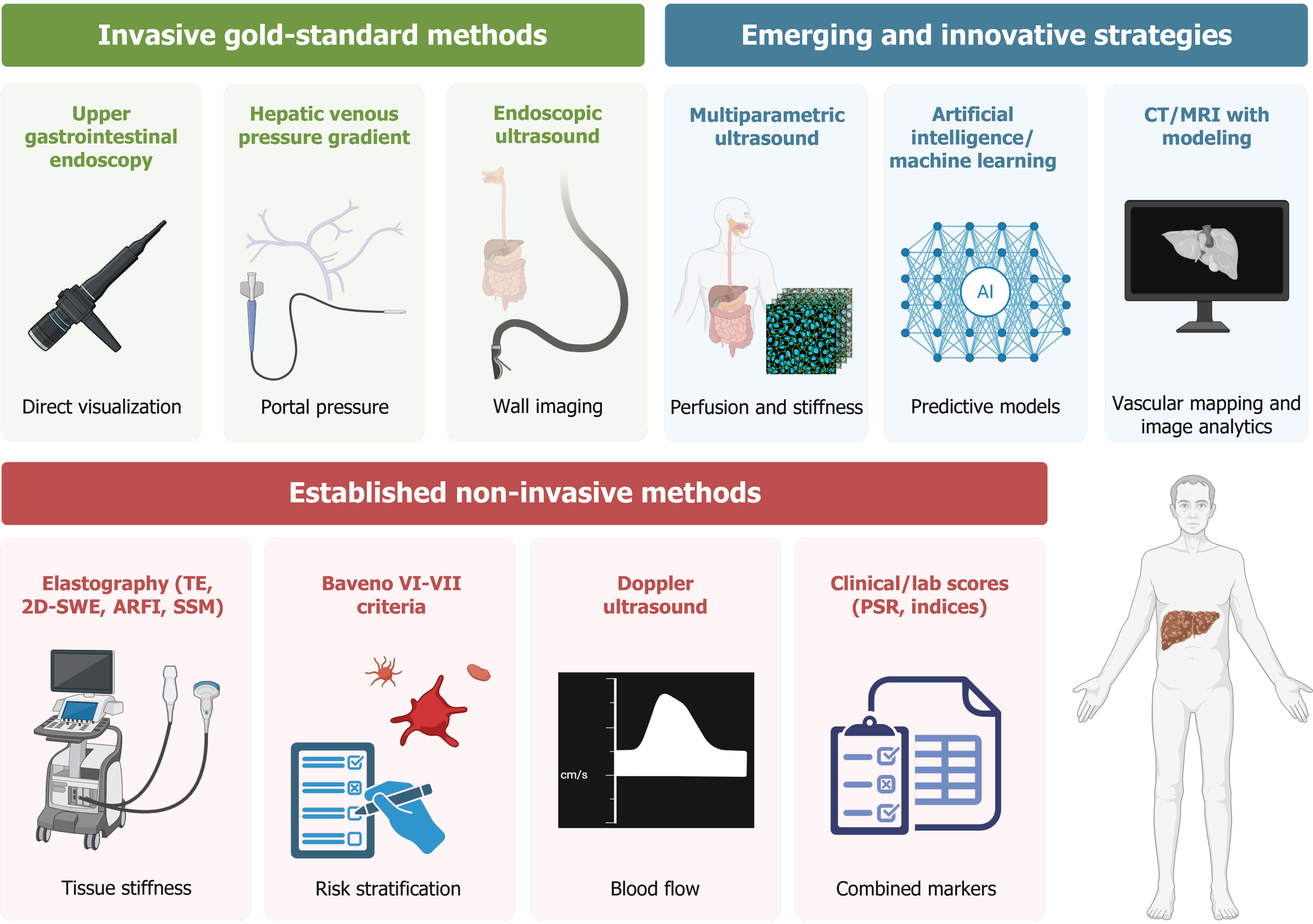 Figure 1 Diagnostic approaches for esophageal varices in patients with cirrhosis: From invasive standards to emerging noninvasive tools.