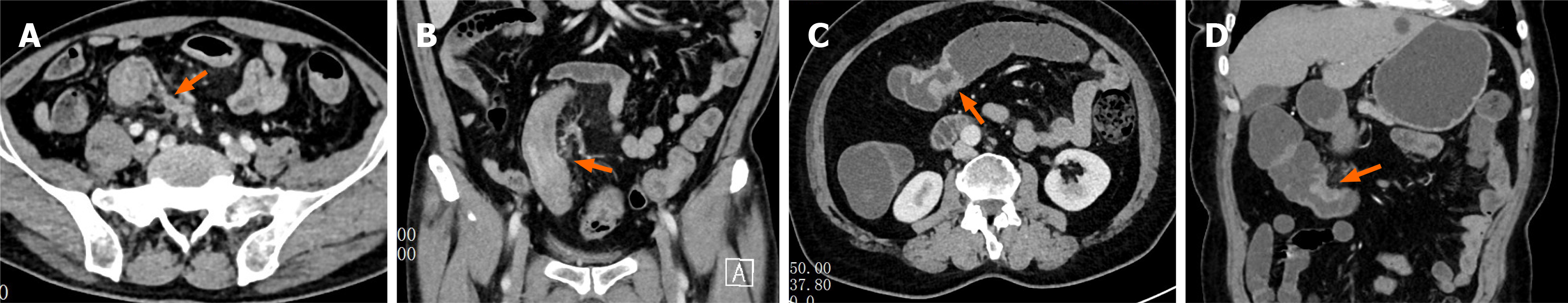 A: Venous-phase axial computed tomography (CT) image demonstrates focal thickening of the sigmoid colon wall with blurred surrounding fat planes, enlarged adjacent extramural vessels with irregular contours, and intraluminal filling defects (arrow); B: Corresponding venous-phase coronal reconstructed image shows marked thickening of the sigmoid colon wall (arrow) and dilated, irregular extramural vessels containing intraluminal filling defects, consistent with CT-detected extramural vascular invasion-positive findings; C: Venous-phase axial CT image shows thickening of the transverse colon wall (arrow) with preserved surrounding fat planes; D: Corresponding venous-phase coronal reconstructed image demonstrates wall thickening of the transverse colon (arrow) without enlargement or irregularity of adjacent extramural vessels and without abnormal intraluminal density, consistent with CT-detected extramural vascular invasion-negative findings.