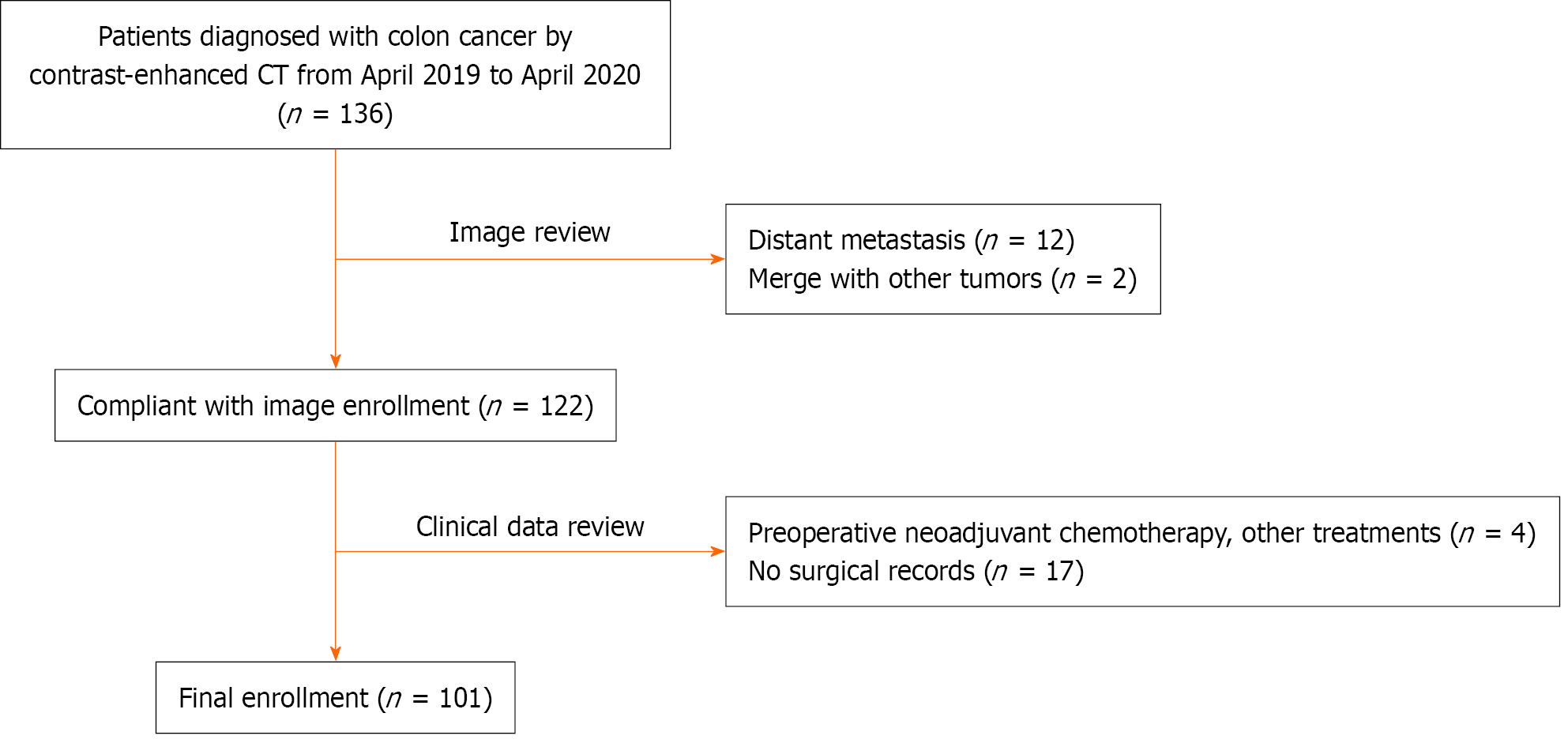 Figure 1 Computed tomography-detected extramural vascular invasion assessment of colon cancer patients.