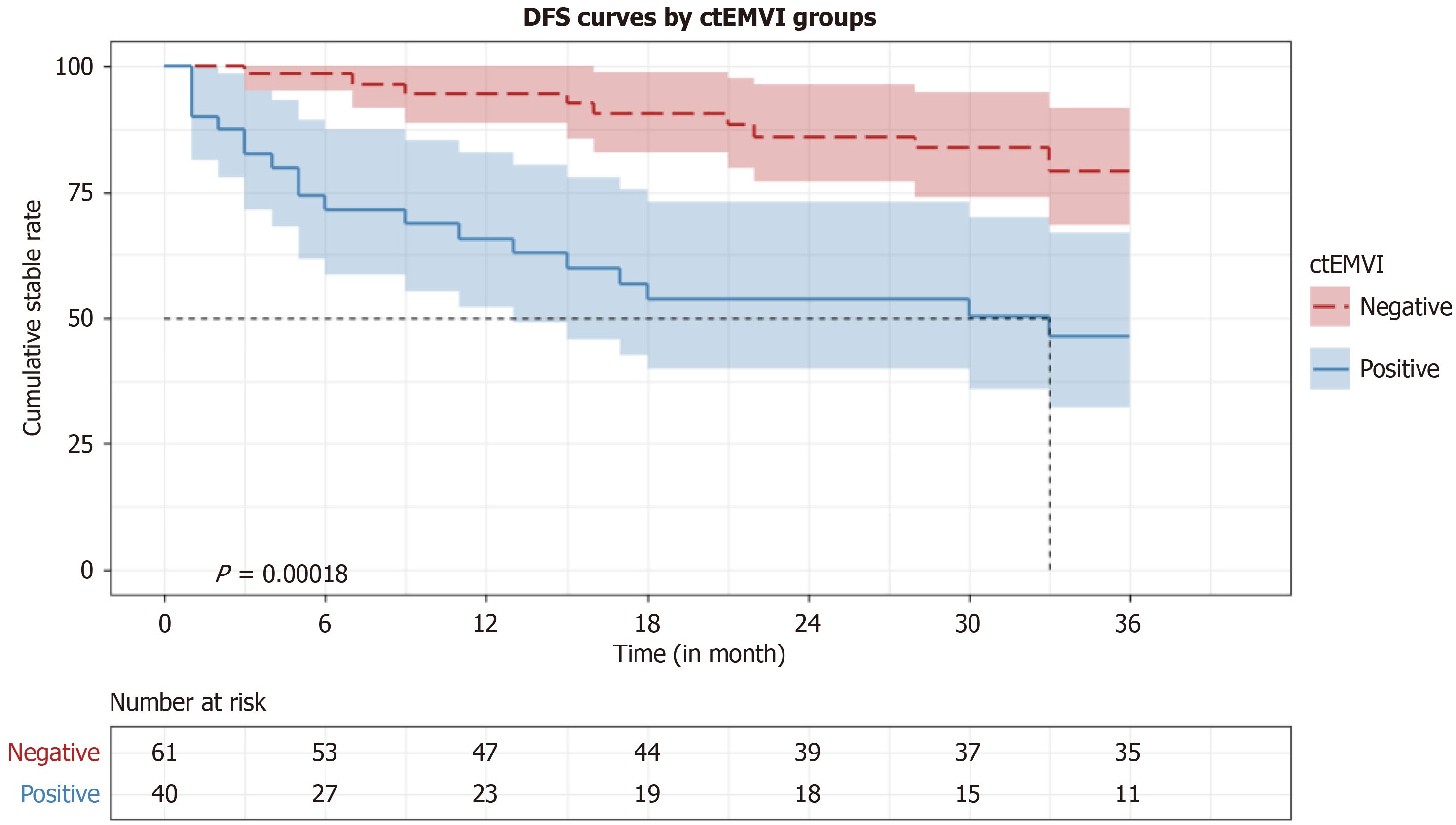 According to the Kaplan-Meier survival curve, the disease-free survival rate in the computed tomography-detected extramural vascular invasion -positive group was lower than that in the computed tomography-detected extramural vascular invasion-negative group (χ² = 13.991, P = 0.00018). ctEMVI: Computed tomography-detected extramural vascular invasion; DFS: Disease-free survival.