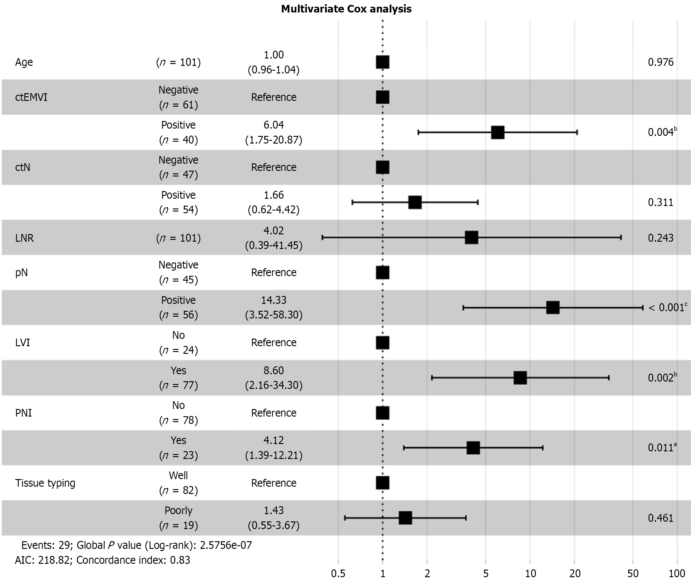 aP < 0.05, bP < 0.01, cP < 0.001. AIC: Akaike information criterion; ctEMVI: Computed tomography-detected extramural vascular invasion; ctN: Lymph node status determined by computed tomography; LNR: Lymph node ratio; LVI: Lymphovascular invasion; pN: Pathological nodal status; PNI: Perineural invasion.