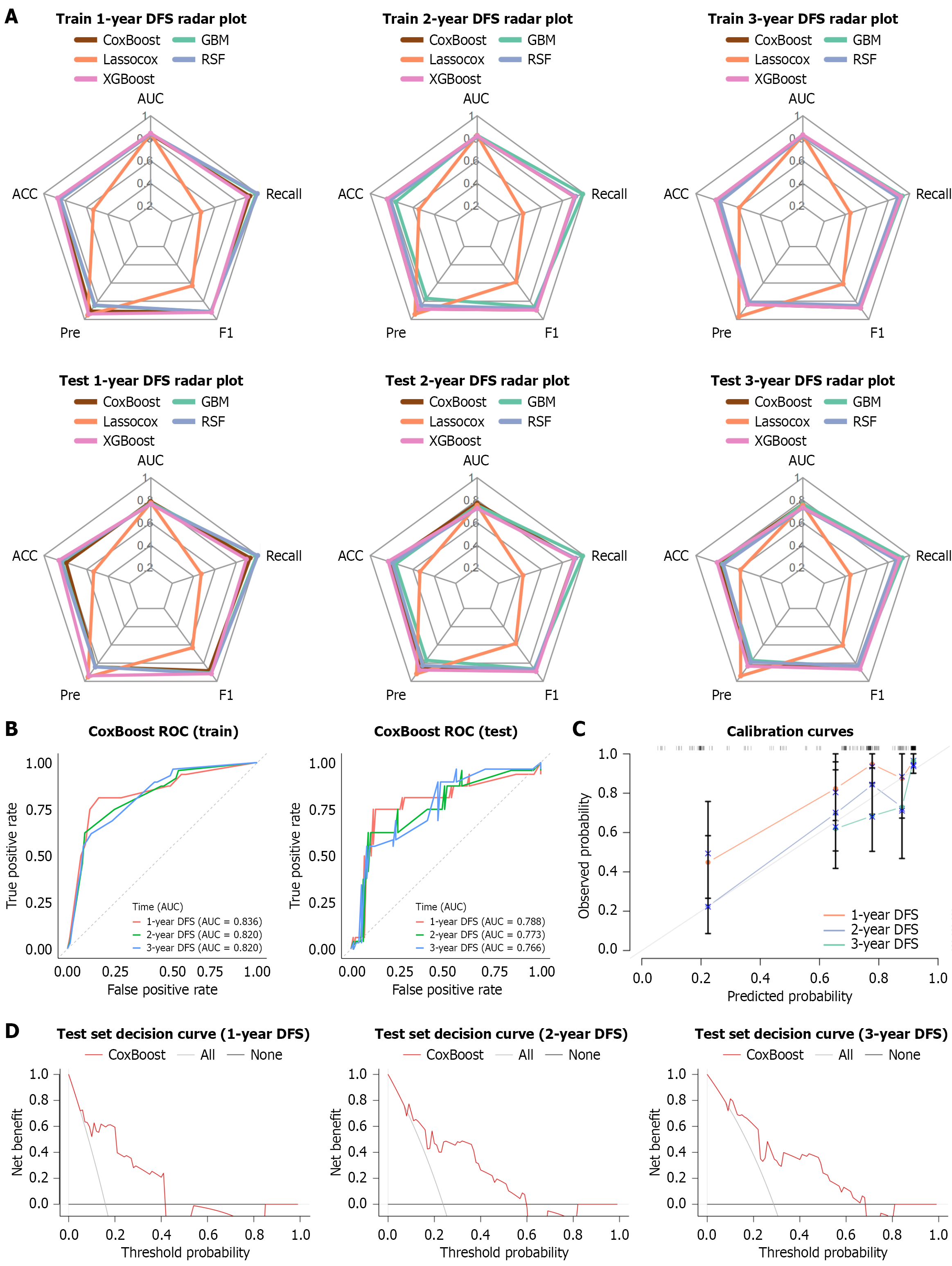 A: The performance comparison of the five machine learning models on the training and test set was presented using radar plots; B: Receiver operating characteristic used to evaluate the CoxBoost model; C: Calibration curve of the CoxBoost model on the train set; D: Decision curve of the CoxBoost model on the train set. ACC: Accuracy; AUC: Area under the receiver operating characteristic curve; DFS: Disease-free survival; GBM: Gradient boosting machine; LASSO: Least absolute shrinkage and selection operator; Pre: Precision; ROC: Receiver operating characteristic; RSF: Random survival forest.