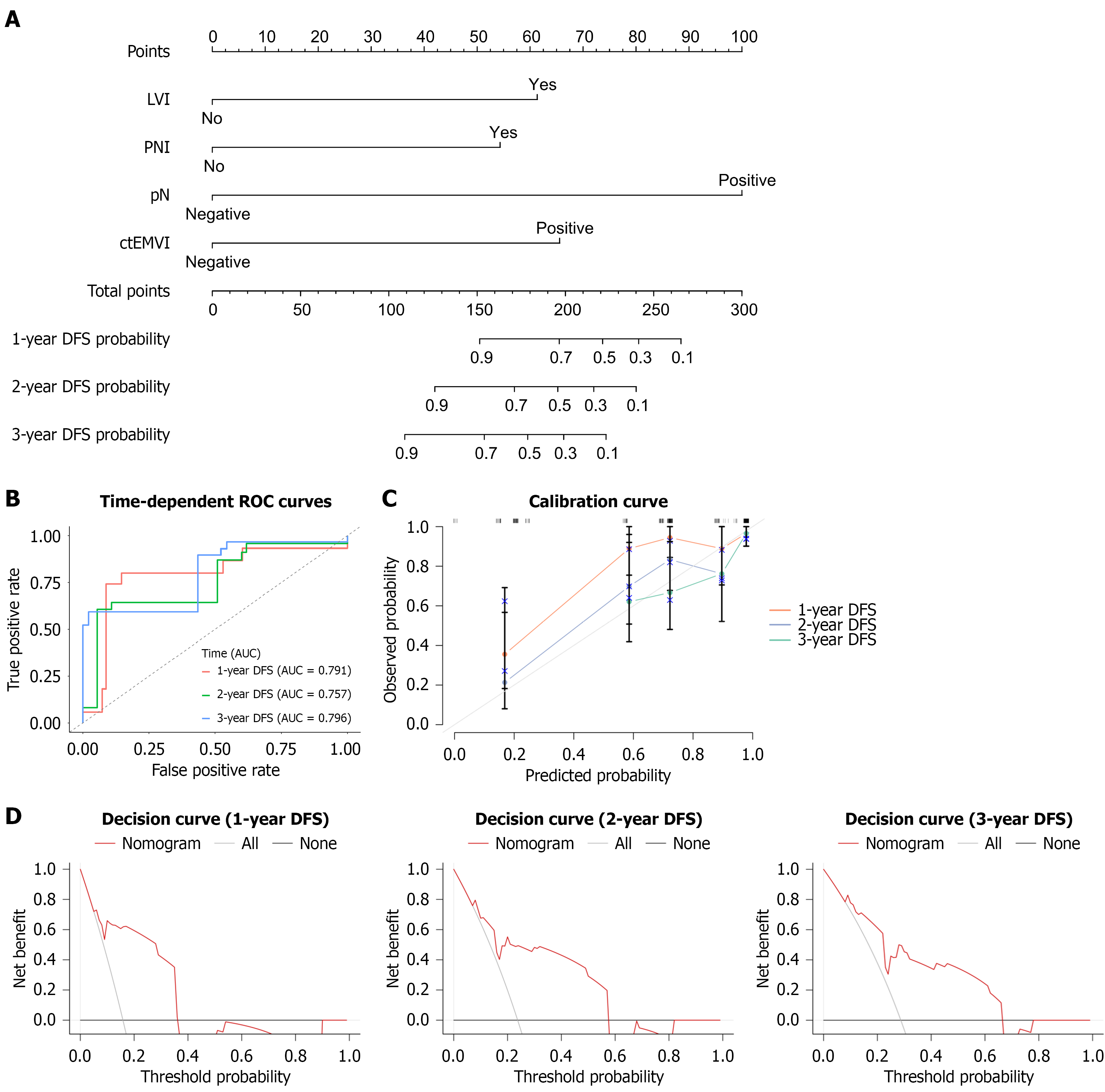 A: Nomogram model constructed based on independent prognostic factors; B: Receiver operating characteristic used to evaluate the nomogram model; C: Calibration curve of the nomogram model; D: Decision curve of the nomogram model. AUC: Area under the receiver operating characteristic curve; ctEMVI: Computed tomography-detected extramural vascular invasion; DFS: Disease-free survival; LVI: Lymphovascular invasion; pN: Pathological nodal status; PNI: Perineural invasion; ROC: Receiver operating characteristic.