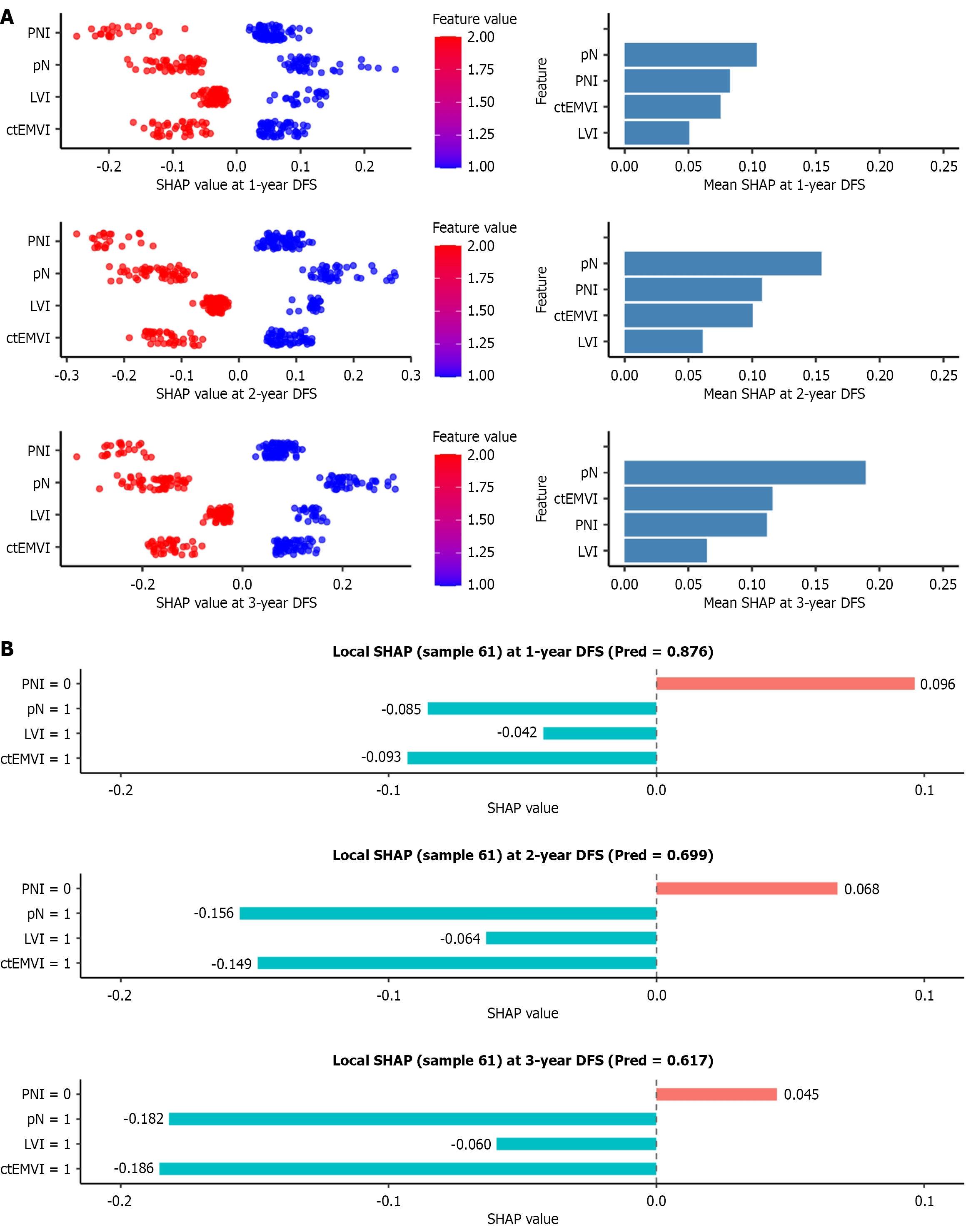 A: Attributes of characteristics in SHapley Additive exPlanations. The scatter plot on the left shows the distribution of SHapley Additive exPlanations values for each case with respect to the given feature. The bar chart on the right displays the overall importance ranking of the features in disease-free survival (DFS) prediction; B: Individual efforts by patients with DFS after surgery. The predicted probabilities of DFS at 1-year, 2-year, and 3-year are 0.876, 0.699, and 0.617, respectively. In the figure, red features indicate an increase in the predicted probability, while blue features indicate a decrease in the predicted probability. ctEMVI: Computed tomography-detected extramural vascular invasion; DFS: Disease-free survival; LVI: Lymphovascular invasion; pN: Pathological nodal status; PNI: Perineural invasion; SHAP: SHapley Additive exPlanations.