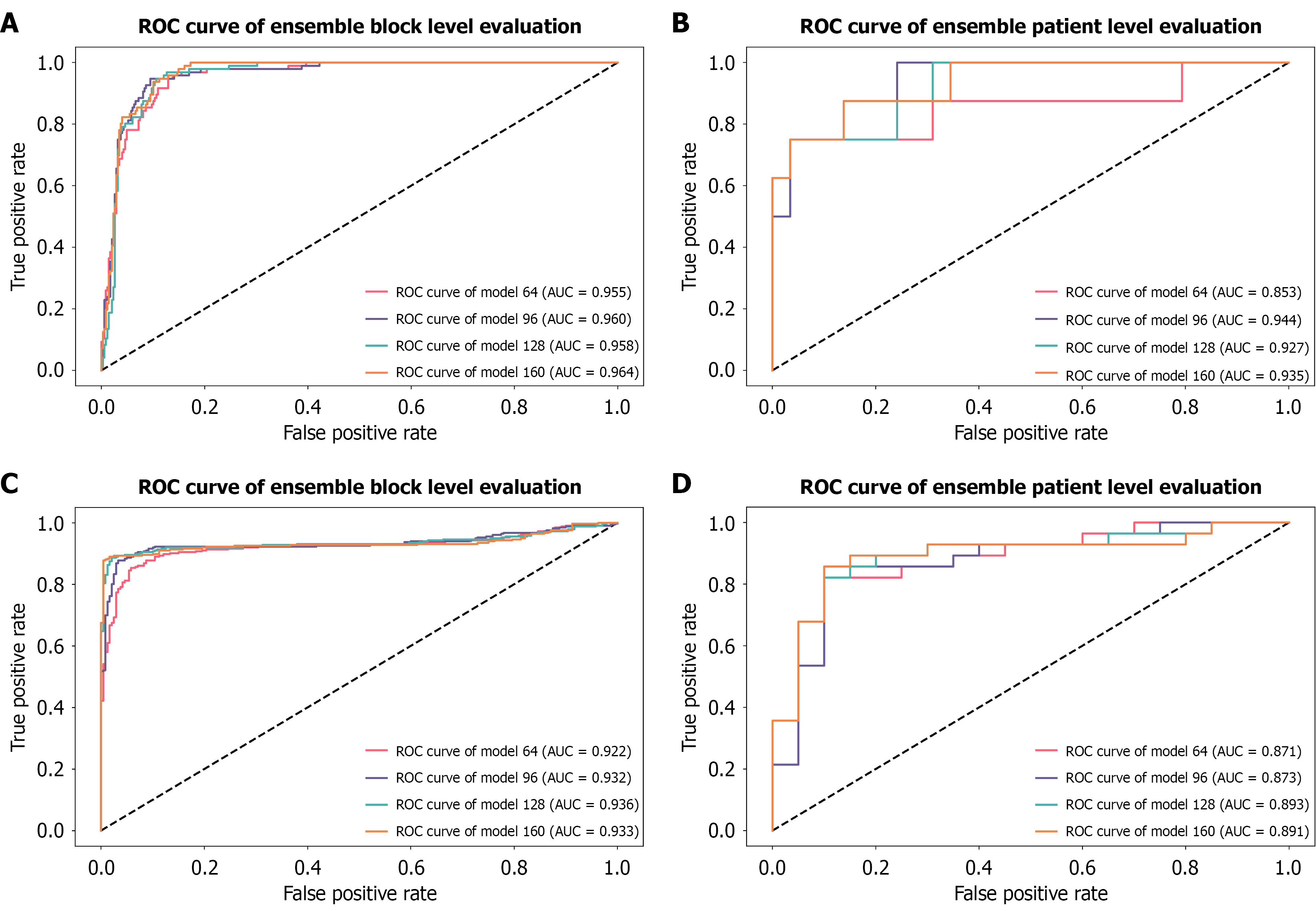 A and B: Based on the internal test cohort; C and D: Based on the external test cohort. A and C represent the block-level results, while B and D represent the patient-level results. AUC: Area under the curve; ROC: Receiver operating characteristic.