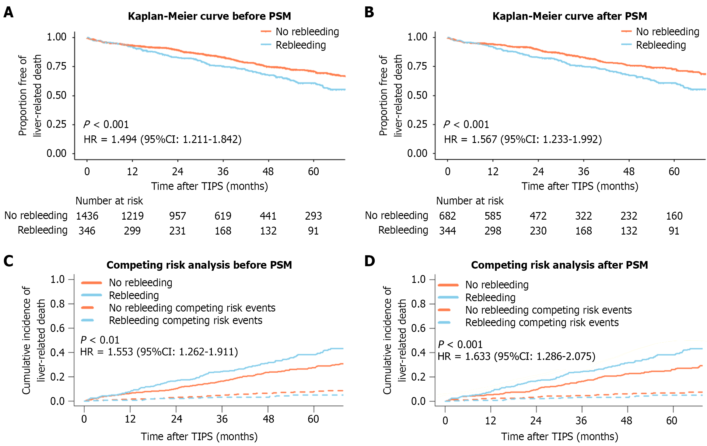 A: Kaplan-Meier curve before propensity score matching (PSM); B: Kaplan-Meier curve after PSM; C: Competing risk analysis before PSM; D: Competing risk analysis after PSM. HR: Hazard ratio; PSM: Propensity score matching; CI: Confidence interval; TIPS: Transjugular intrahepatic portosystemic shunt.