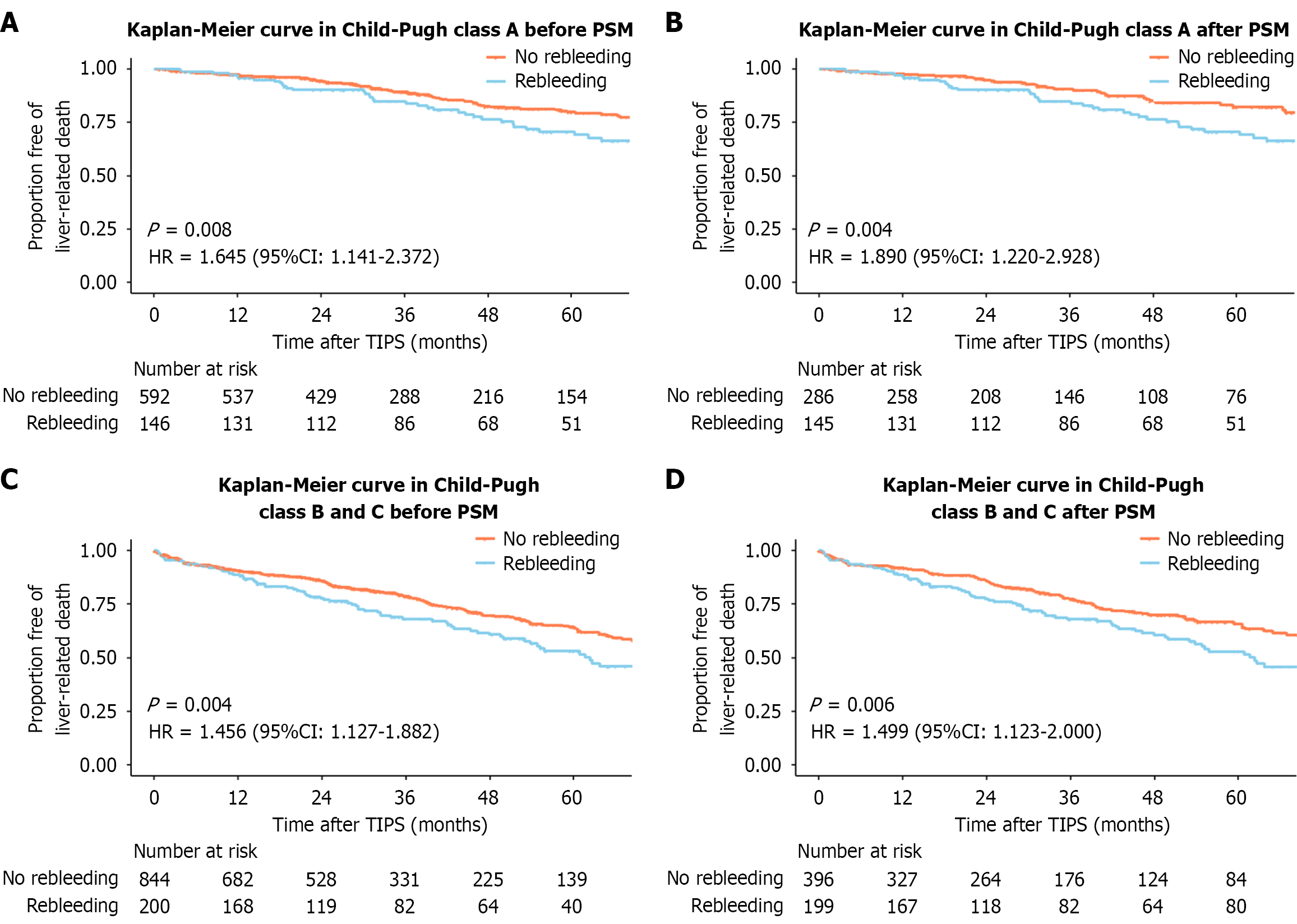 A: Kaplan-Meier curve in Child-Pugh class A before propensity score matching (PSM); B: Kaplan-Meier curve in Child-Pugh class A after PSM; C: Kaplan-Meier curve in Child-Pugh class B/C before PSM; D: Kaplan-Meier curve in Child-Pugh class B/C after PSM. HR: Hazard ratio; PSM: Propensity score matching; TIPS: Transjugular intrahepatic portosystemic shunt; CI: Confidence interval.