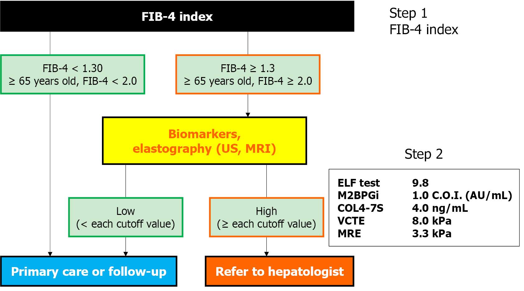 The algorithm for referral from a primary care physician to a hepatologist to narrow down cases of metabolic dysfunction-associated steatotic liver disease with advanced liver fibrosis is shown. First, the fibrosis-4 index is evaluated (step 1), and if the score is 1.30 or equal to or greater than 2.00 age 65 or older, the patient is evaluated using one of the various noninvasive tests (step 2). Patients with high values are referred to a hepatologist (refer to hepatologist). In cases followed by a family physician or a regular physician (primary care or follow-up), it is recommended to repeat the above procedure every 2-3 years. FIB-4: Fibrosis-4; US: Ultrasound; MRI: Magnetic resonance imaging; ELF: Enhanced liver fibrosis; M2BPGi: Mac-2-binding protein glycosylation isomer; C.O.I.: Cutoff index; COL4-7S: Type IV collagen 7S; VCTE: Vibration-controlled transient elastography; MRE: Magnetic resonance elastography.