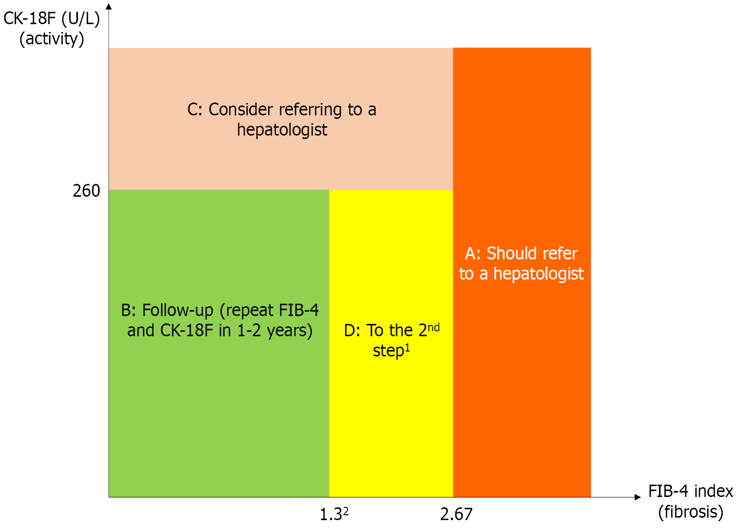 A: High-risk group (orange). Patients with fibrosis-4 (FIB-4) > 2.67 should be referred to a hepatologist regardless of cytokeratin 18 fragment (CK-18F) levels due to the high risk of advanced fibrosis; B: Low-risk group (green). Patients with FIB-4 < 1.3 and CK-18F < 260 U/L are considered to have minimal fibrosis and inflammation. Follow-up with repeat FIB-4 and CK-18F testing every 1-2 years is recommended; C: Referral consideration group (pink). Patients with CK-18F ≥ 260 U/L may have progressive inflammation. Consider referring to a hepatologist for pathologic evaluation; D: Intermediate-risk group (yellow). Patients with FIB-4 of 1.30-2.67 and CK-18F < 260 U/L may include cases of full-blown metabolic dysfunction-associated steatohepatitis with advanced fibrosis. 1Indicates further evaluation with the enhanced liver fibrosis test, Mac-2-binding protein glycosylation isomer, type IV collagen 7S, vibration-controlled transient elastography, or magnetic resonance elastography will be necessary to confirm fibrosis status. 2Indicates a fibrosis-4 index of 2.0 is considered intermediate risk for patients age 65 or older. CK-18F: Cytokeratin 18 fragment; FIB-4: Fibrosis-4.