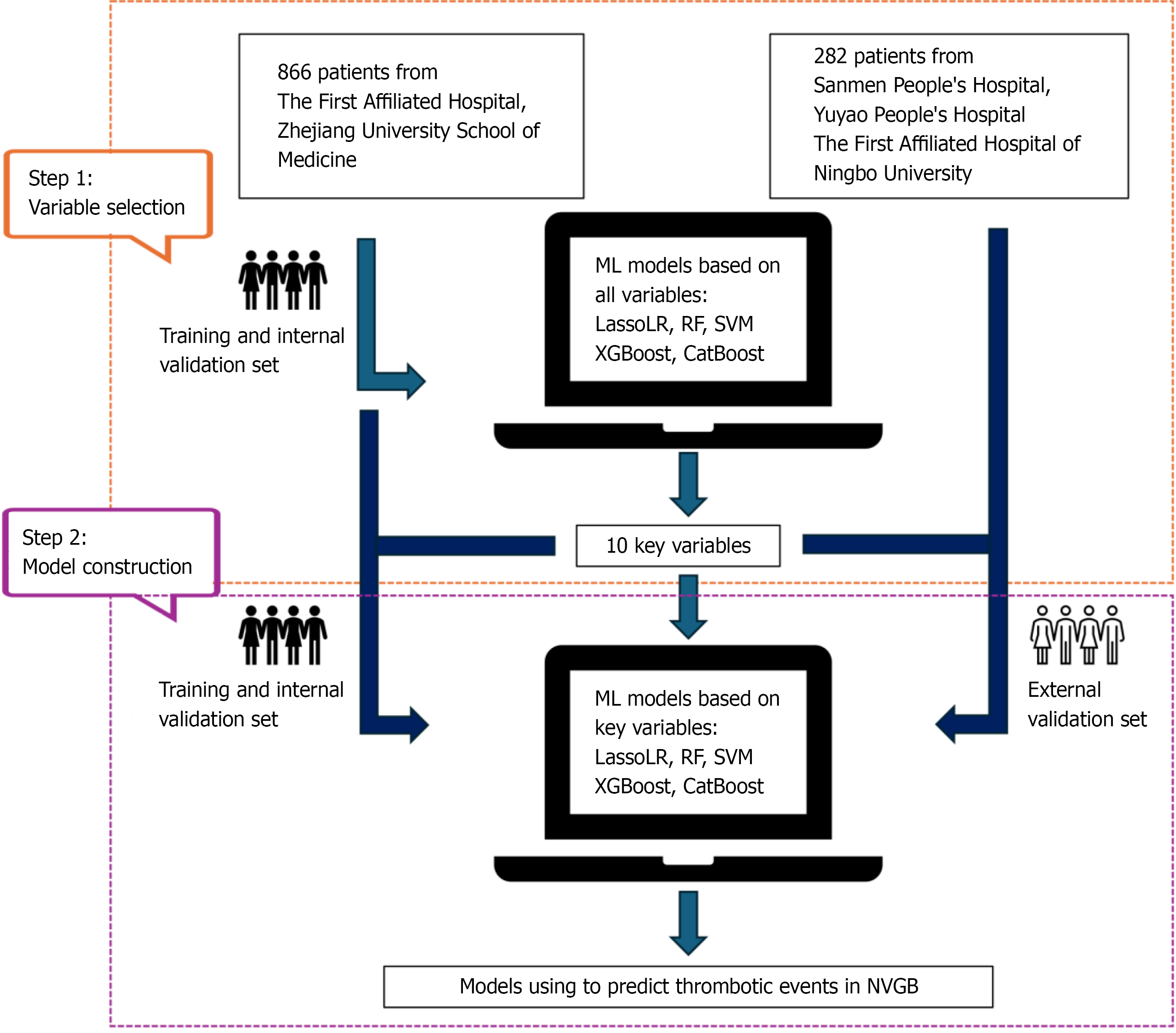 CatBoost: Categorical boosting; LassoLR: L1 regularized logistic regression; ML: Machine learning; NVGB: Nonvariceal gastrointestinal bleeding; RF: Random forest; SVM: Support vector machines; XGBoost: Extreme gradient boosting.