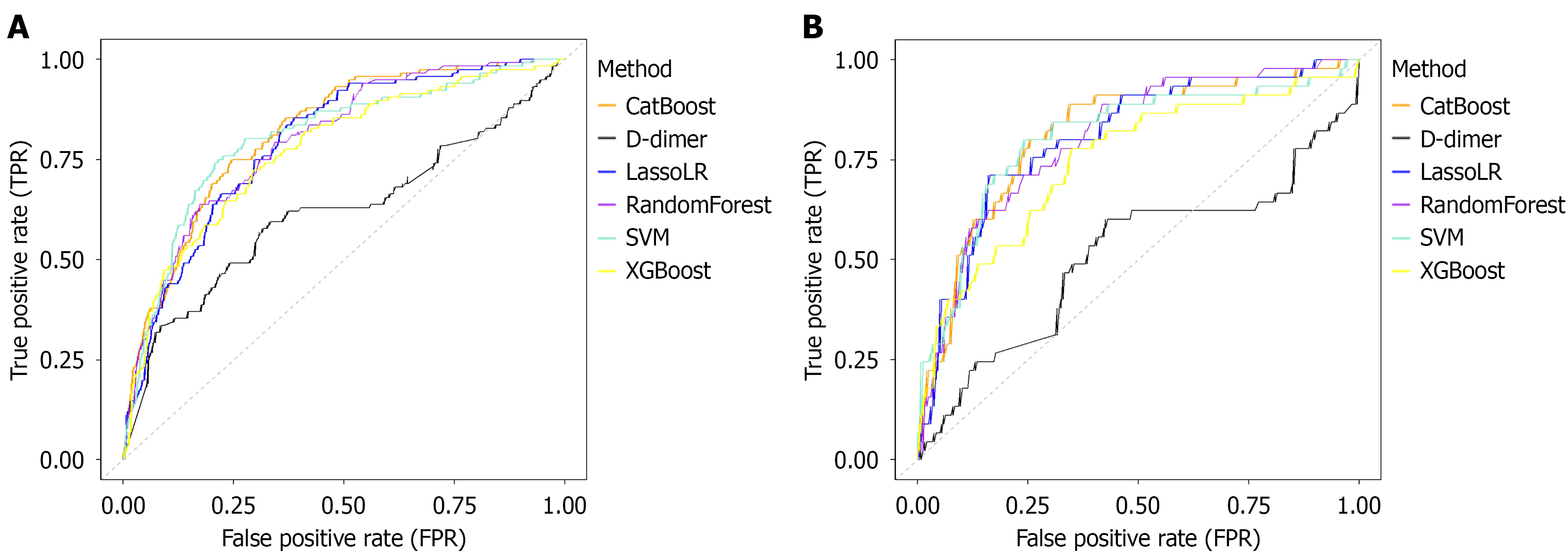 A: Categorical boosting, L1 regularized logistic regression; B: Random forest for predicting thromboembolic events showed good performance. CatBoost: Categorical boosting; LassoLR: L1 regularized logistic regression; SVM: Support vector machines; XGBoost: Extreme gradient boosting.