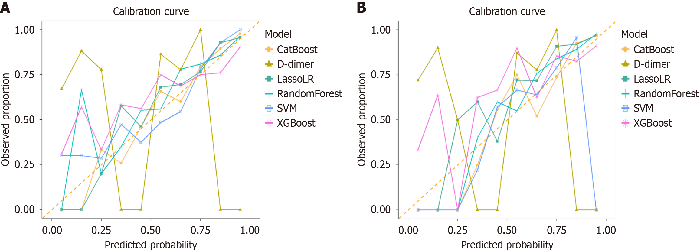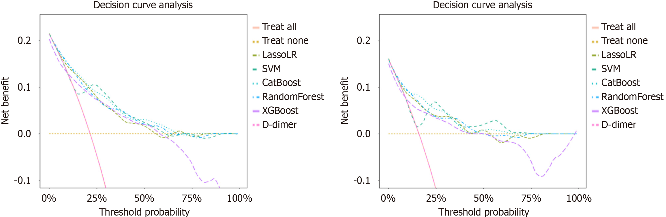 The results showed that compared with the D-dimer, all machine learning models demonstrated higher net benefits across most threshold probability ranges. CatBoost: Categorical boosting; LassoLR: L1 regularized logistic regression; SVM: Support vector machines; XGBoost: Extreme gradient boosting.