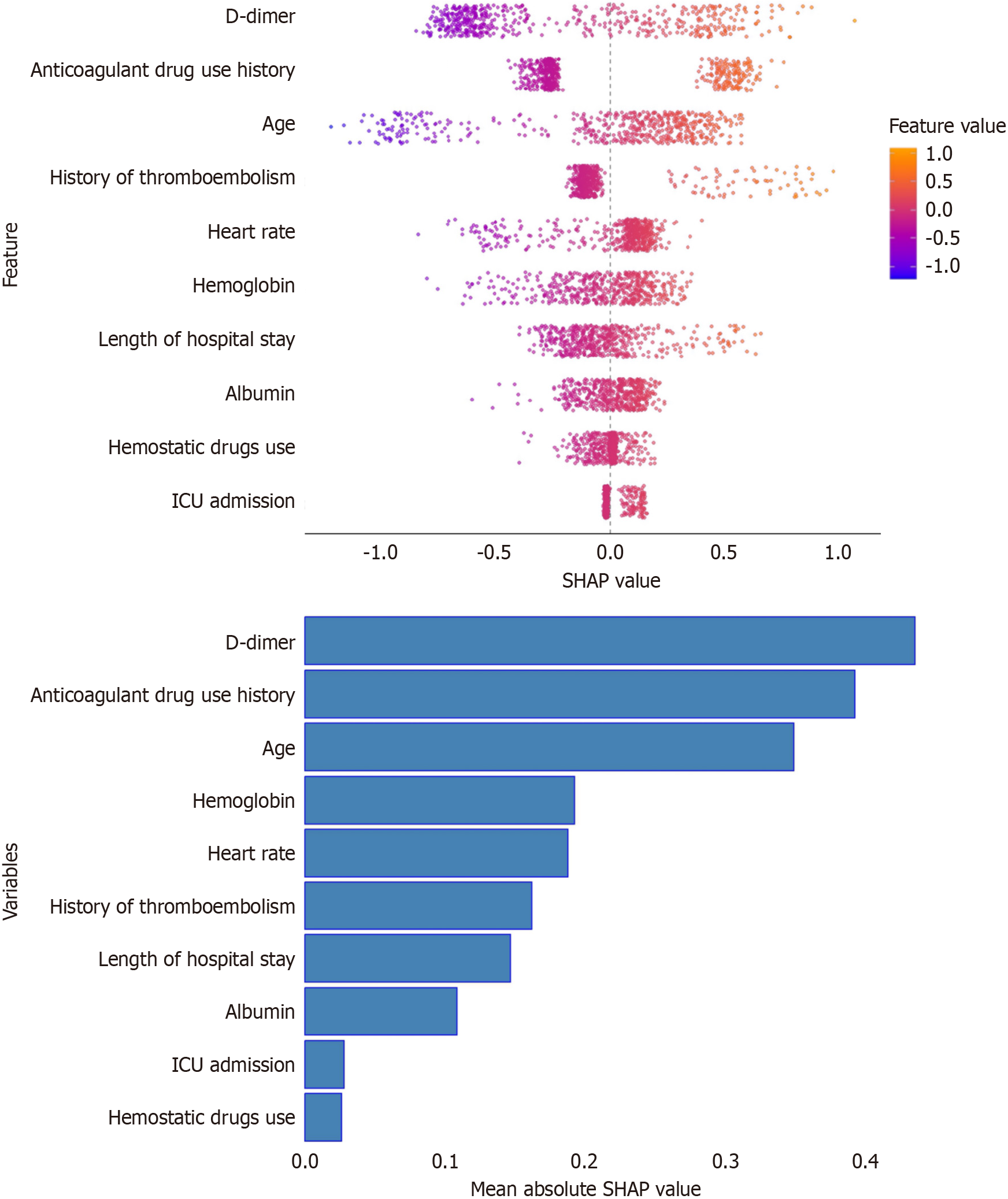The mean SHapley Additive exPlanations values of 10 important features and the influence of input features on the model's output. ICU: Intensive care unit.