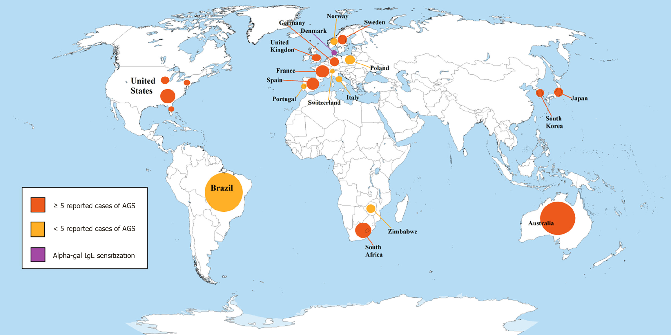 Figure 1 Geographic distribution of countries with alpha-gal syndrome cases or IgE sensitization.