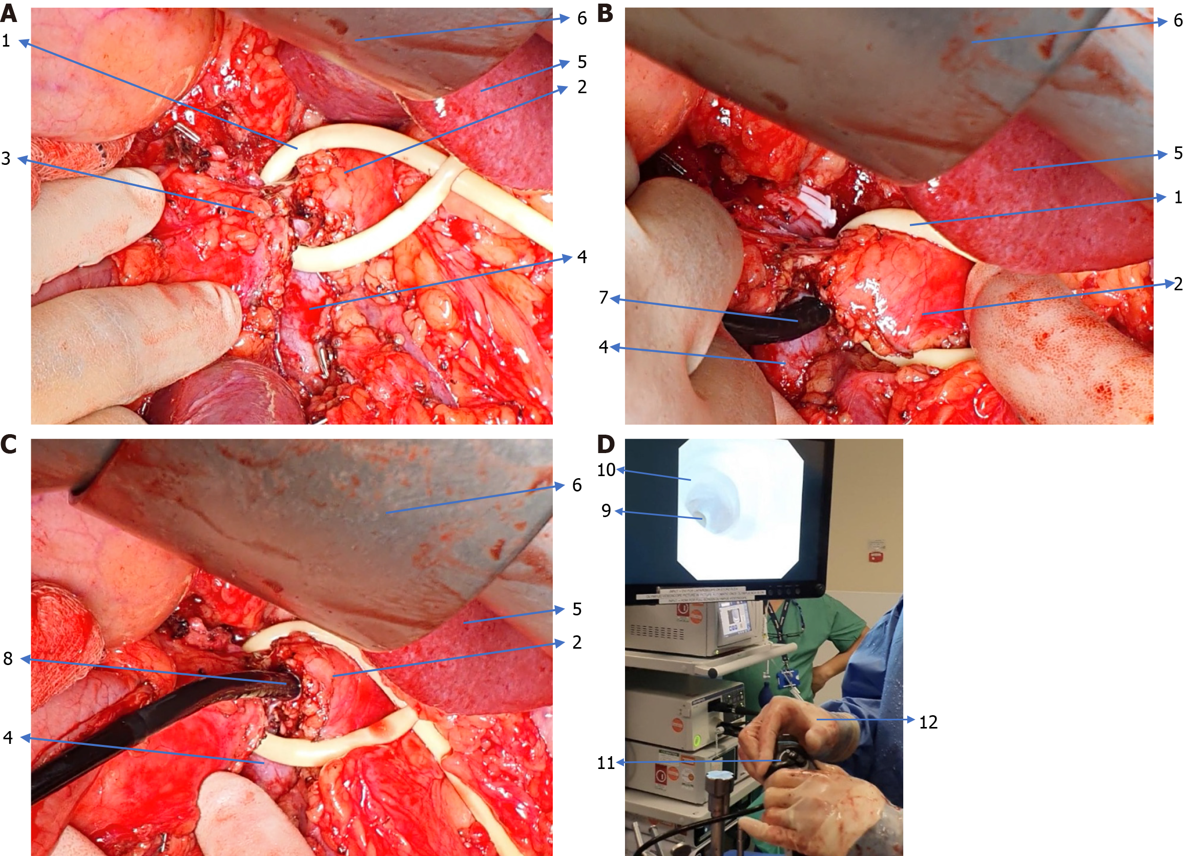 A: Isolation of the main pancreatic duct; B: Scope insertion into the main pancreatic duct; C: Scope lying within the main pancreatic duct handled by the surgeon; D: On-screen pancreatoscopic view with choledochoscope stack. 1: Sling isolating the neck of the pancreas and main pancreatic duct; 2: Body and tail of the pancreas; 3: Head of the pancreas; 4: Superior mesenteric vein; 5: Liver; 6: Retractor; 7: Choledochoscope; 8: Choledochoscope inserted into main pancreatic duct; 9: Inside view of main pancreatic duct; 10: Pancreatic duct lumen; 11: Choledochoscope used for pancreatoscopy; 12: Operating surgeon handling scope.