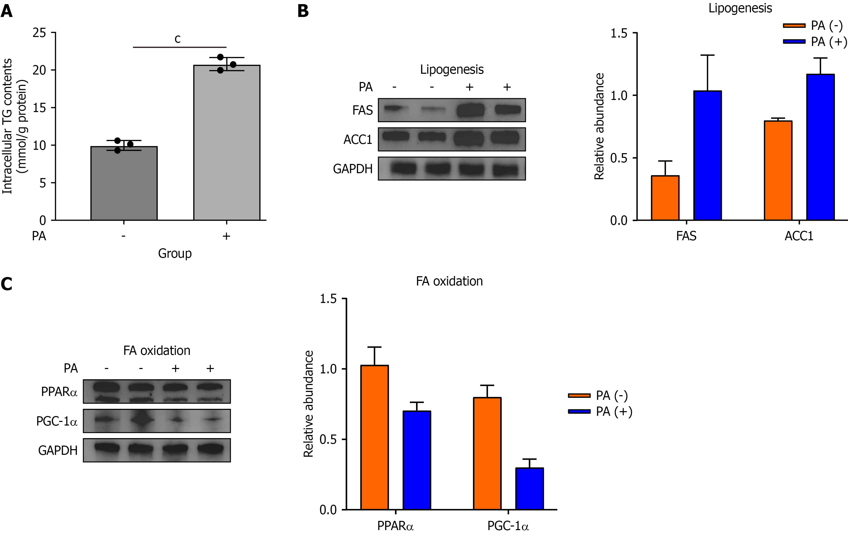 AML-12 cells were treated with 300 μM palmitate acid (PA) for 24 hours to establish an in vitro model of metabolic dysfunction-associated steatotic liver disease. A: Intracellular triglyceride content in PA-stimulated AML-12 cells (n = 3/group); B: The protein expressions of lipogenesis target genes, fatty acid synthase, and acetyl-CoA carboxylase 1, were detected via Western blotting; C: The protein expressions of genes involved in fatty acid β-oxidation, such as peroxisome proliferator-activated receptor α and peroxisome proliferator-activated receptor gamma coactivator 1α, were detected via Western blotting. Data are presented as the mean ± SD. cP < 0.001. P value calculated between groups. TG: Triglyceride; PA: Palmitate acid; FA: Fatty acid; FAS: Fatty acid synthase; GAPDH: Glyceraldehyde-3-phosphate dehydrogenase; ACC1: Acetyl-CoA carboxylase 1; PPAR: Peroxisome proliferator-activated receptor; PGC-1α: Peroxisome proliferator-activated receptor gamma coactivator 1α.