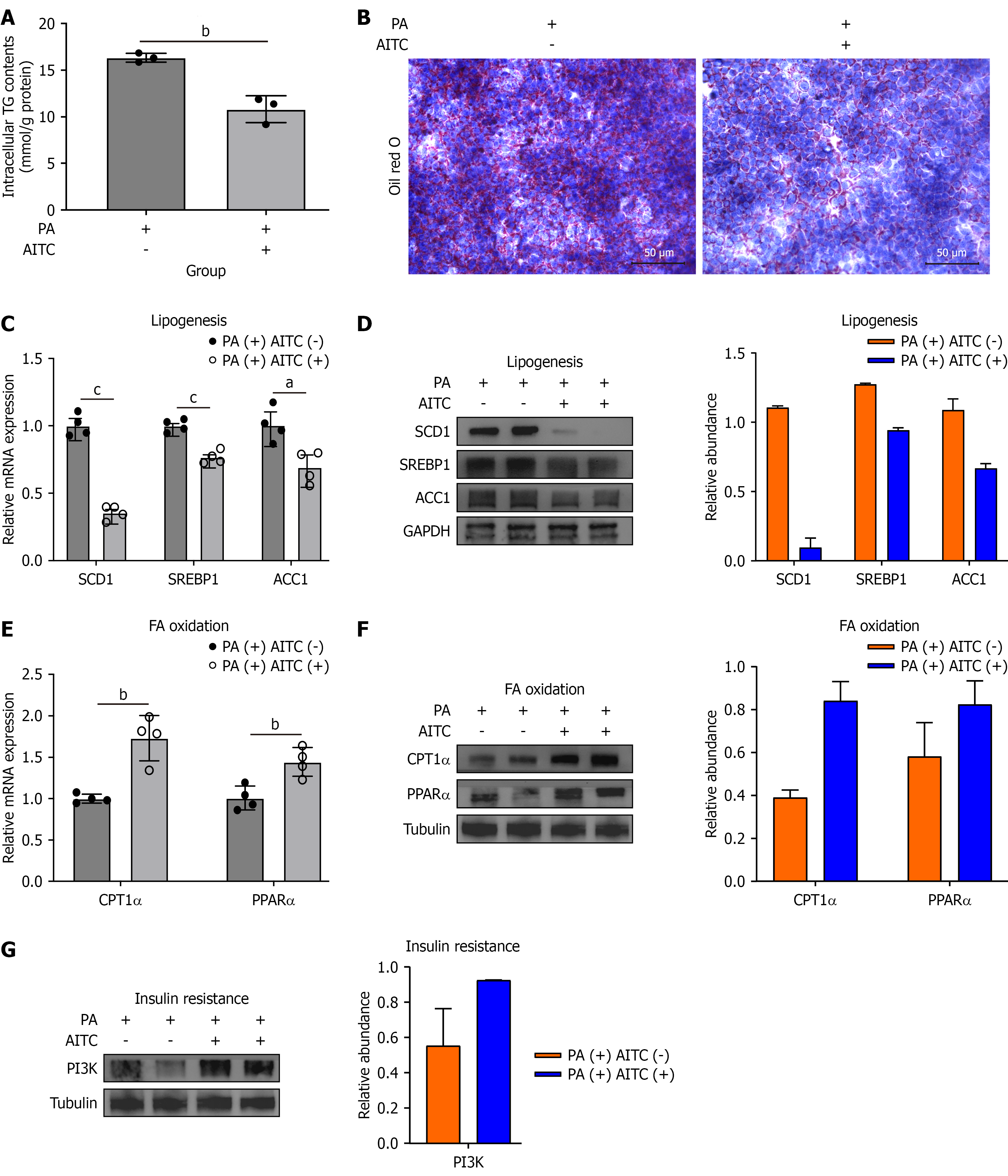 AML-12 cells were treated with 20 μmol/L allyl isothiocyanate or vehicle for 24 hours to stimulate palmitate acid. A: Intracellular triglyceride content in AML-12 cells (n = 3/group); B: Representative image of oil red O staining of AML-12 cells in the two groups; C: The messenger RNA (mRNA) levels of stearoyl-CoA desaturase 1 (SCD1), sterol regulatory element-binding protein (SREBP1), and acetyl-CoA carboxylase 1 (ACC1) were detected (n = 4/group); D: The protein expressions of SCD1, SREBP1, and ACC1 were determined by Western blot analysis; E: The mRNA levels of the fatty acid β-oxidation-related genes carnitine palmitoyl transferase 1 alpha (CPT1α) and peroxisome proliferator-activated receptor alpha (PPARα) were detected (n = 4/group); F: The protein expressions of CPT1α and PPARα were determined by Western blot analysis; G: The protein expression of the insulin resistance-related gene phosphatidylinositol 3-kinase was determined by Western blot analysis. The scale bar in the panel represents 50 μm. Data are presented as the mean ± SD. aP < 0.05. bP < 0.01. cP < 0.001. P calculated between groups. TG: Triglyceride; PA: Palmitate acid; AITC: Allyl isothiocyanate; ACC1: Acetyl-CoA carboxylase 1; mRNA: Messenger RNA; SCD1: Stearoyl-CoA desaturase 1; SREBP1: Sterol regulatory element-binding protein 1; GAPDH: Glyceraldehyde-3-phosphate dehydrogenase; PPAR: Peroxisome proliferator-activated receptor; CPT1α: Carnitine palmitoyl transferase 1 alpha; FA: Fatty acid; PI3K: Phosphatidylinositol 3-kinase.