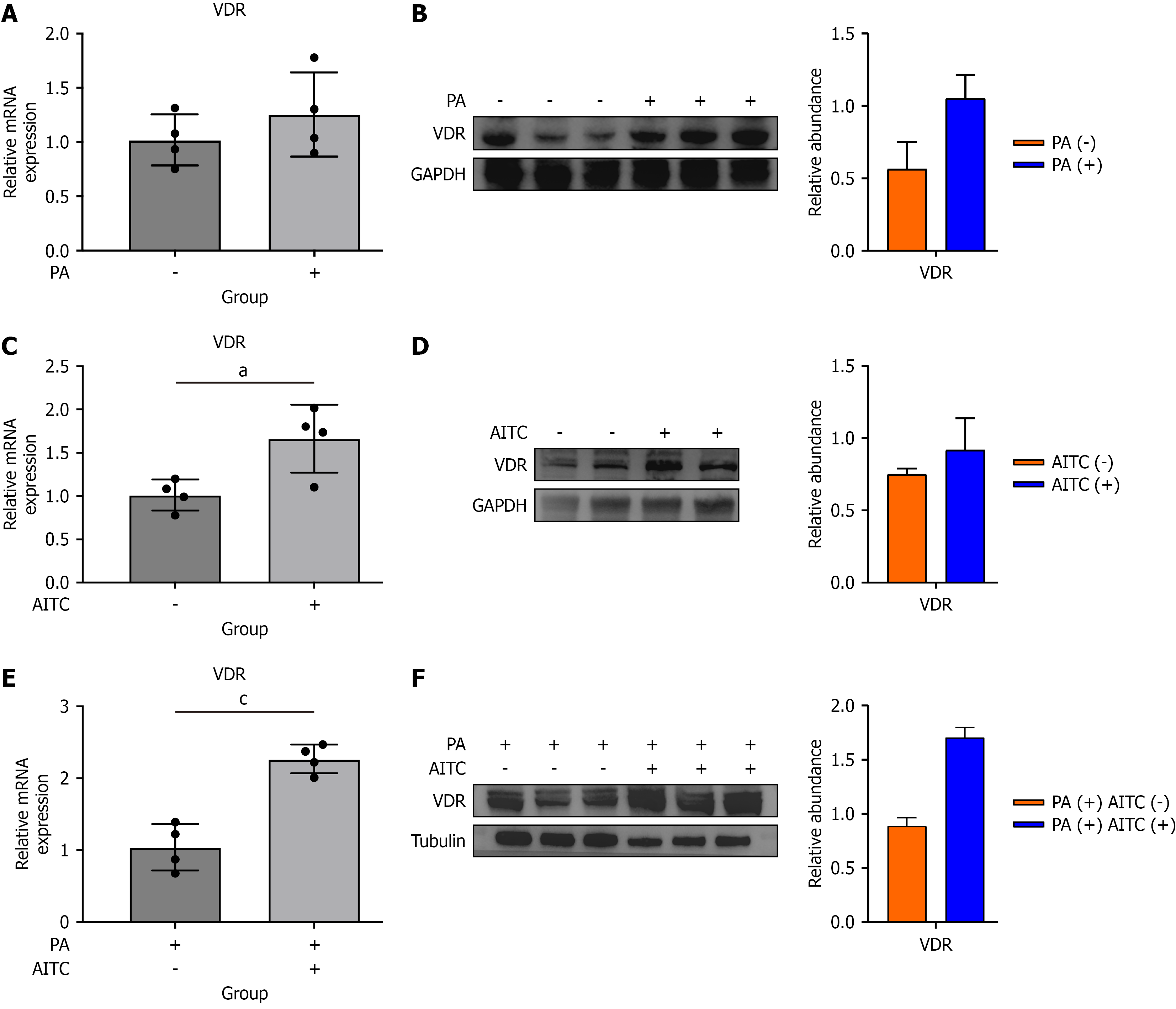 A: The messenger RNA (mRNA) level of the vitamin D receptor (VDR) was detected in palmitate acid-stimulated AML-12 cells (n = 4/group); B: The protein expression of VDR was determined by Western blot analysis; C: The mRNA level of VDR was detected in allyl isothiocyanate (AITC)-stimulated AML-12 cells (n = 4/group); D: The protein expression of VDR in AITC-stimulated AML-12 cells; E: The mRNA level of VDR was detected in an AITC-stimulated in vitro metabolic dysfunction-associated steatotic liver disease model; F: The protein expression of VDR was determined by Western blot analysis. Data are presented as the mean ± SD. aP < 0.05. cP < 0.001. P calculated between groups. PA: Palmitate acid; AITC: Allyl isothiocyanate; VDR: Vitamin D receptor; mRNA: Messenger RNA; GAPDH: Glyceraldehyde-3-phosphate dehydrogenase.