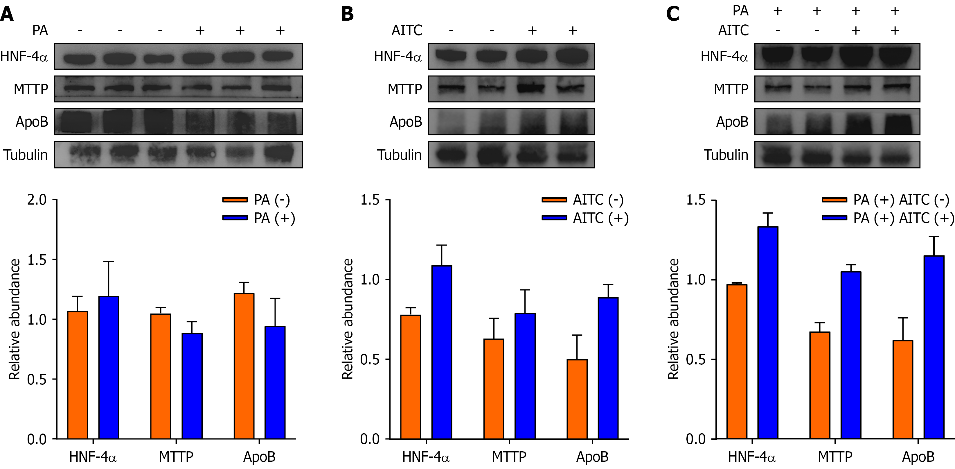 A: The protein expressions of hepatocyte nuclear factor 4 alpha (HNF-4α), microsomal triglyceride transfer protein (MTTP) and apolipoprotein B (ApoB) in palmitate acid-stimulated AML-12 cells were determined by Western blot analysis; B: The protein expressions of HNF-4α, MTTP, and ApoB in allyl isothiocyanate (AITC)-stimulated AML-12 cells were detected by Western blot analysis; C: The protein expressions of HNF-4α, MTTP, and ApoB in the AITC-stimulated in vitro metabolic dysfunction-associated steatotic liver disease model were determined by Western blot analysis. PA: Palmitate acid; AITC: Allyl isothiocyanate; HNF-4α: Hepatocyte nuclear factor 4 alpha; MTTP: Microsomal triglyceride transfer protein; ApoB: Apolipoprotein B.