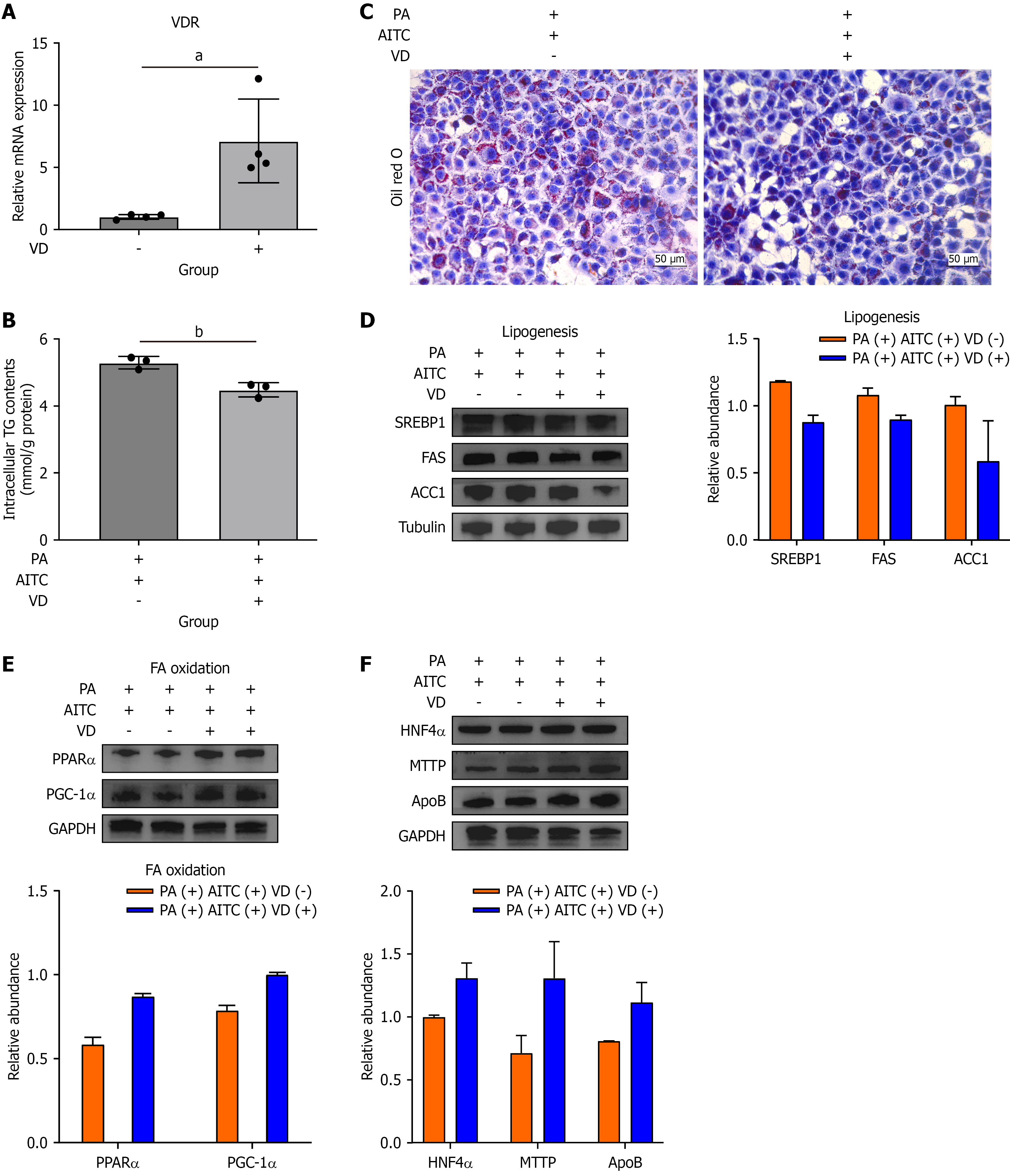 AML-12 cells were treated with 600 nM vitamin D for 24 hours. A: The messenger RNA level of the vitamin D receptor was detected in AML-12 cells after vitamin D stimulation (n = 4/group); B: Intracellular triglyceride content in AML-12 cells was detected (n = 3/group); C: Oil red O staining of the vitamin D-stimulated in vitro metabolic dysfunction-associated steatotic liver disease model; D: The protein expressions of lipogenesis-related genes, including sterol regulatory element binding protein 1, fatty acid synthase and acetyl-CoA carboxylase 1, were detected via Western blotting; E: The protein expressions of fatty acid β-oxidation-related genes, including peroxisome proliferator-activated receptor α and peroxisome proliferator-activated receptor gamma coactivator 1α, were detected via Western blotting; F: The protein expressions of hepatocyte nuclear factor 4 alpha, microsomal triglyceride transfer protein, and apolipoprotein B were determined by Western blot analysis. The scale bar in the panel represents 50 μm. Data are presented as the mean ± SD. aP < 0.05. bP < 0.01. P calculated between groups. VDR: Vitamin D receptor; VD: Vitamin D; mRNA: Messenger RNA; TG: Triglyceride; PA: Palmitate acid; AITC: Allyl isothiocyanate; FAS: Fatty acid synthase; ACC1: Acetyl-CoA carboxylase 1; SREBP1: Sterol regulatory element-binding protein 1; GAPDH: Glyceraldehyde-3-phosphate dehydrogenase; PPAR: Peroxisome proliferator-activated receptor; PGC-1α: Peroxisome proliferator-activated receptor gamma coactivator 1α; HNF-4α: Hepatocyte nuclear factor 4 alpha; MTTP: Microsomal triglyceride transfer protein; ApoB: Apolipoprotein B.